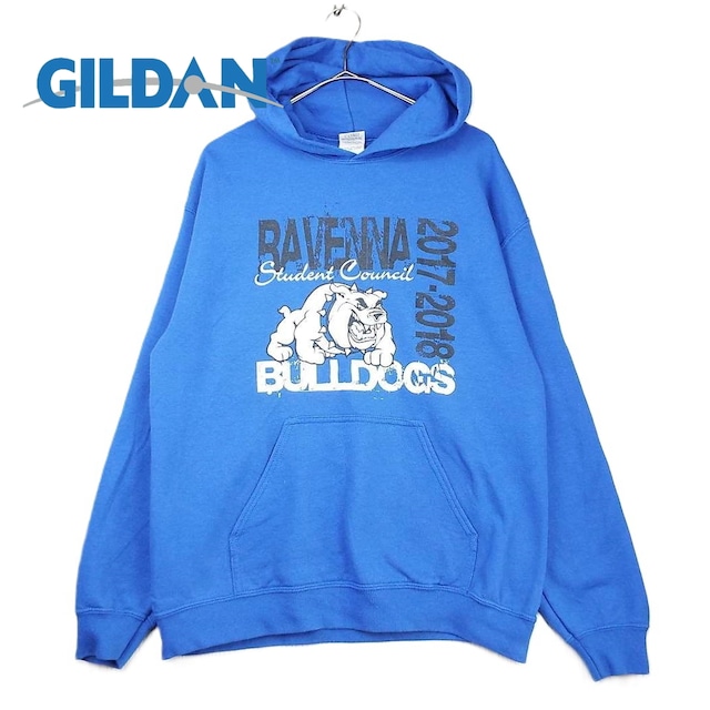 【アメリカ古着】GILDAN(ギルダン)Ravenna Bulldogs RAVENNA 2017-2018 カレッジ チームロゴ 長袖フーテッド スウェット パーカー Mサイズ(肩幅53cm)ブルー【仙台倉庫】USメンズ古着 カラーパーカー