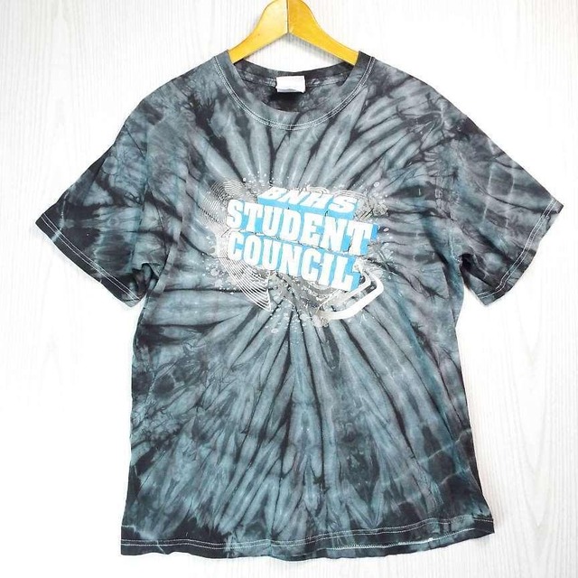 ◎肩幅49cm◎【90-00年代】HANES ヘインズ BNHS STUDENT COUNCIL タイダイ染 スクール 学校 プリント 半袖Tシャツ Lサイズ グレー・ブラック コットン100%【湘南倉庫】USメンズ古着 HEAVY WEIGHT