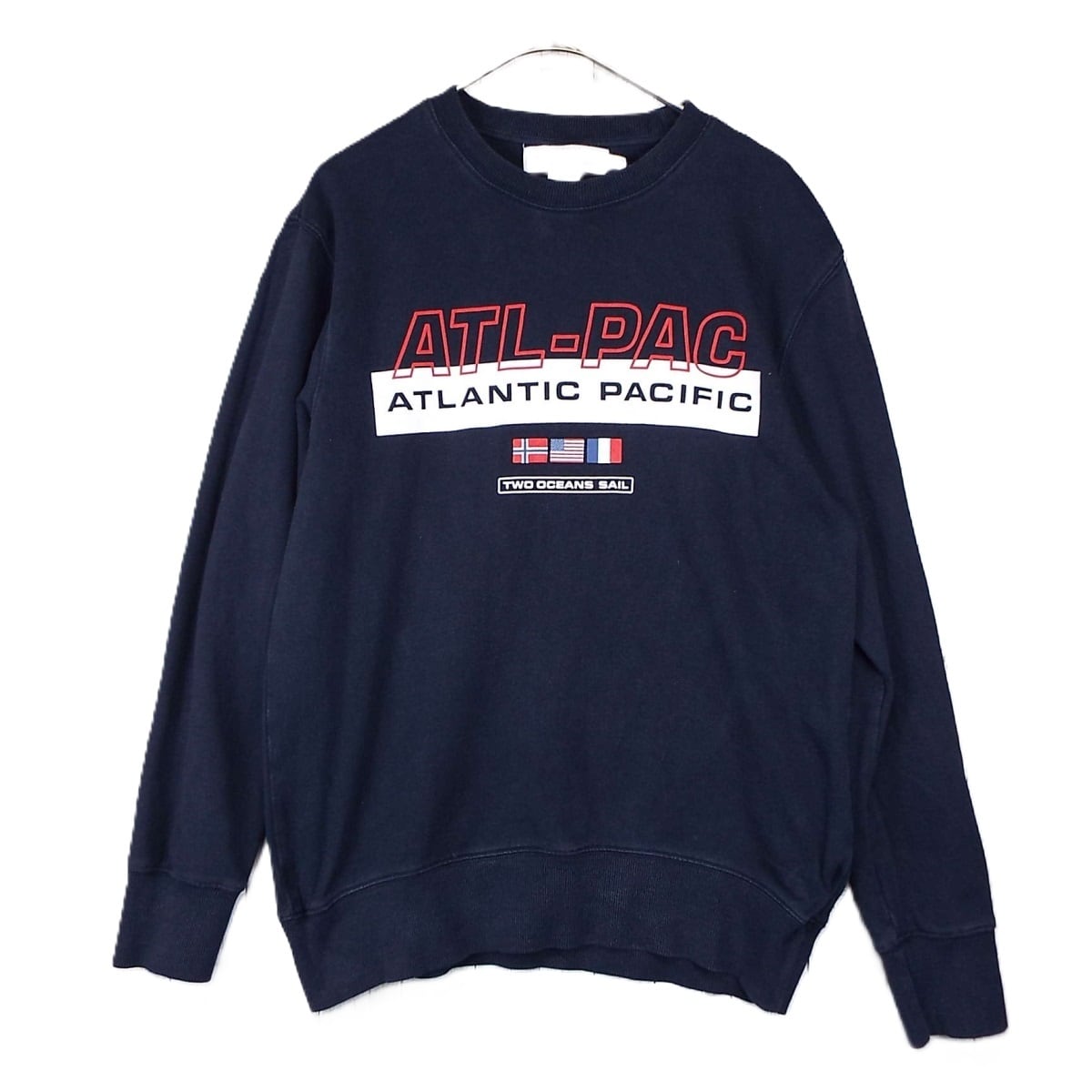 【肩幅47cm】L.O.G.G H&M ログ・エイチアンドエム ATL-PAC ATLANTIC PACIFIC TWO OCEANS SAIL アメリカ フランス ノルウェー カラープリント 長袖トレーナー Sサイズ(170/92)ブラック 【湘南倉庫】USアメリカ古着 星条旗 トリコロール