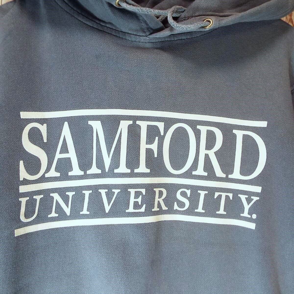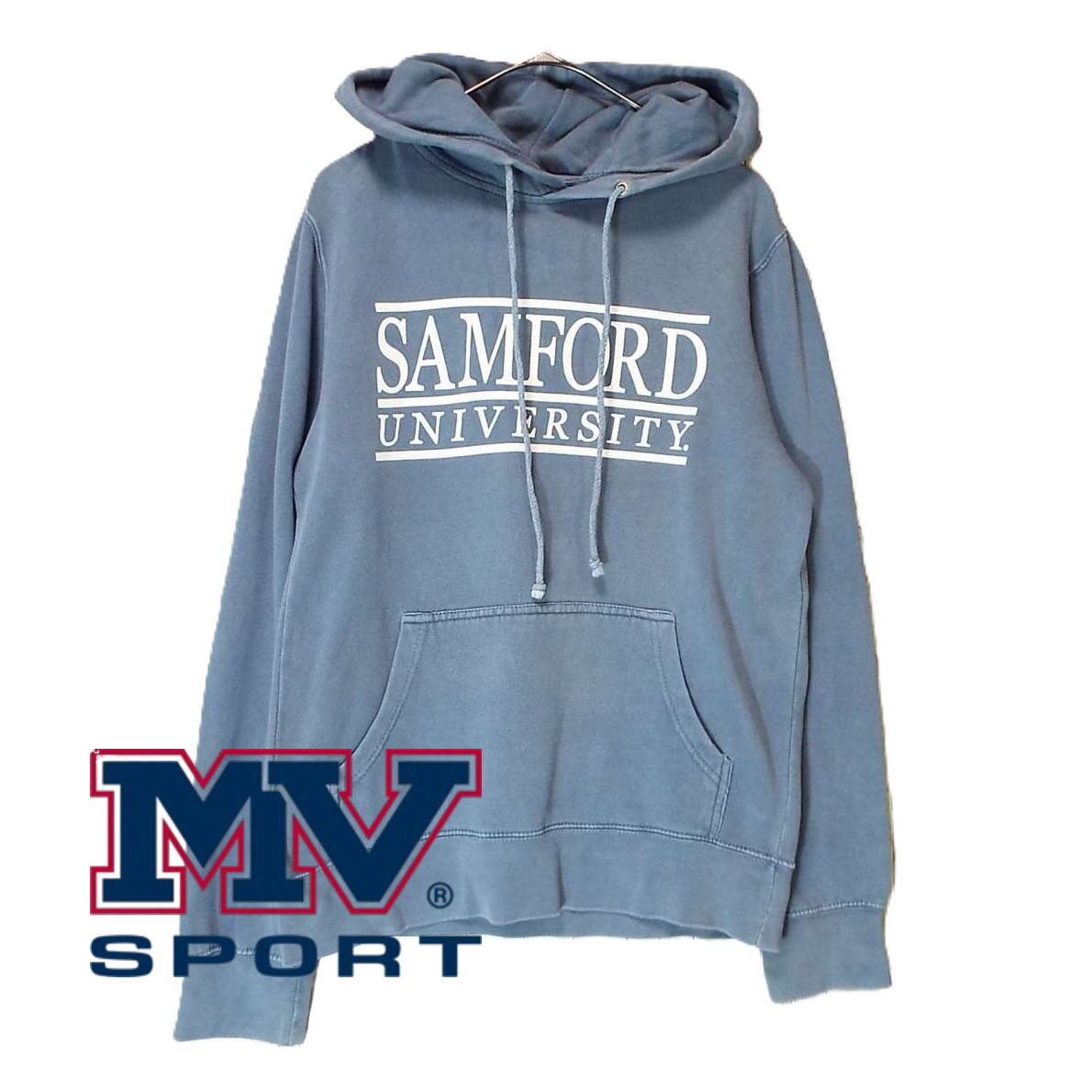 【カレッジロゴ】00s MV SPORT エムブイスポーツ SAMFORD UNIVERSITY サムフォード大学 プリント 長袖スウェット フーテッドパーカー Sサイズ(肩幅45cm)クレープグレー コットンポリエステル(80/20) 【湘南倉庫】USアメリカ メンズ古着 2000年代