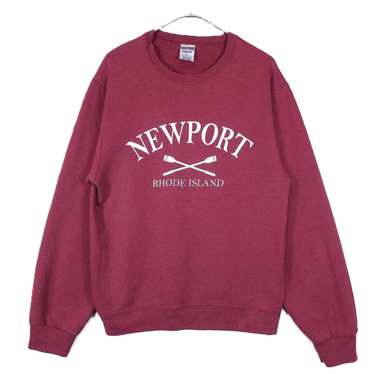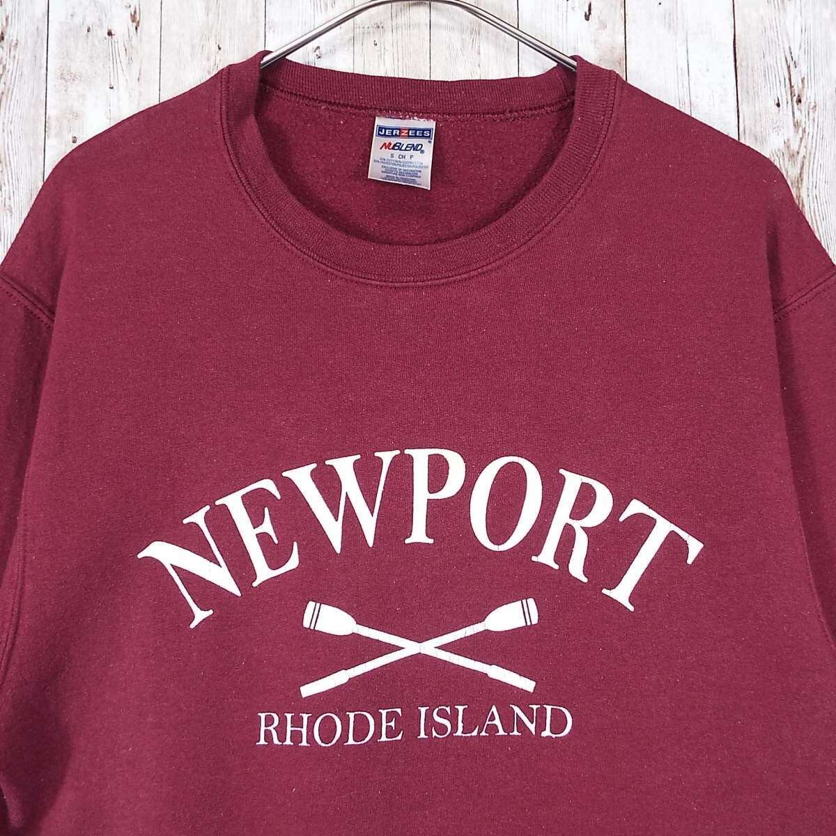 【アーチロゴ】00s JERZEES ジャージーズ NEWPORT RHODE ISLAND ニューポート ロードアイランド クルーネック 長袖スウェット トレーナー Sサイズ(肩幅47cm)ワインレッド コットン・ポリエステル(50/50) 【湘南倉庫】USアメリカ メンズ古着