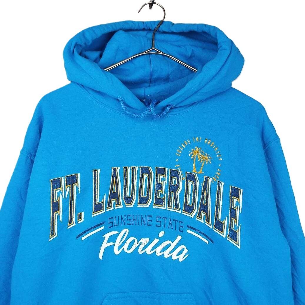 【綺麗系ブルー】GILDAN FT.LAUNDERDALE フロリダ ヤシの木 長袖トレーナー フーテッド スウェット Sサイズ ブルー青 【仙台倉庫】USメンズ古着