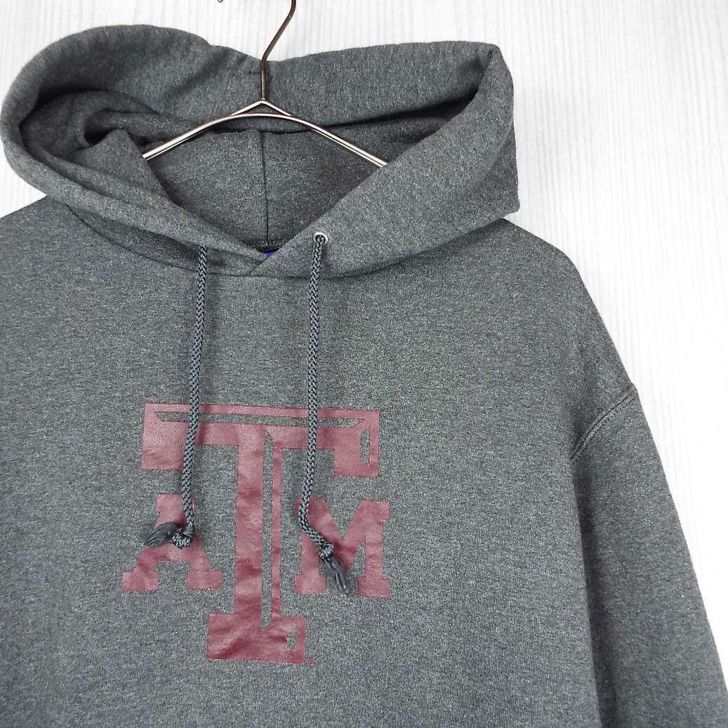 人気のチャンピオンパーカー Sサイズ|Champion ATM 胸プリ ワンポイント 袖ロゴ 目あり フーテッド プルオーバー ダークグレー【仙台倉庫】US古着 パーカー男子女子