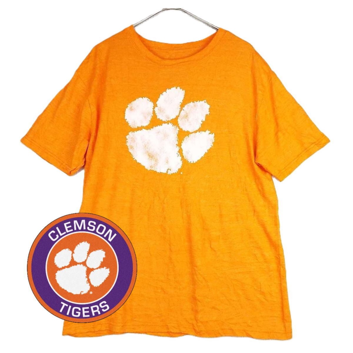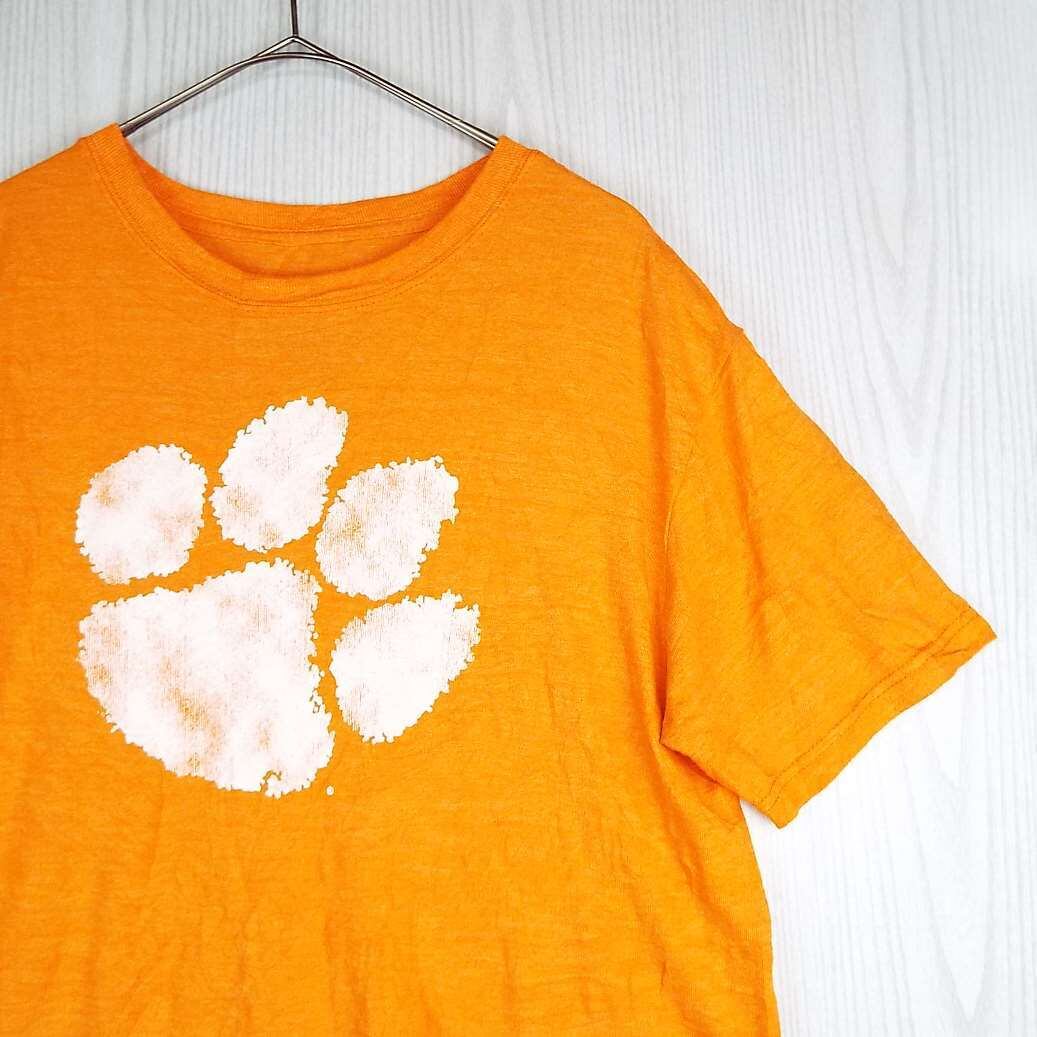 ☆肩幅50.5cm☆【NCAA カレッジロゴ】Clemson Tigers football クレムソン大学 フットボール チーム公式 肉球 大判プリント 半袖Tシャツ Lサイズ コットンオレンジ 【湘南倉庫】USアメリカ古着 T10