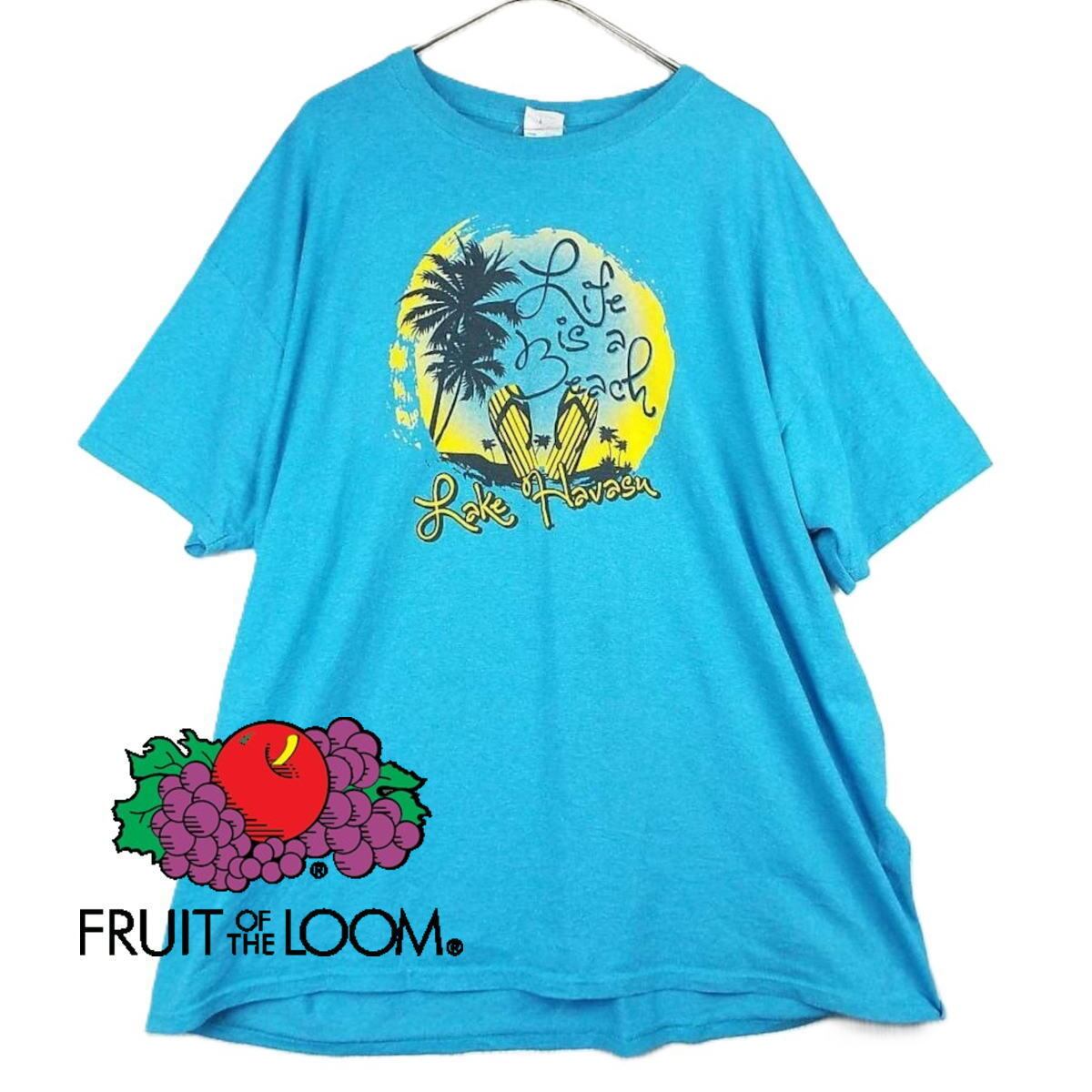 ☆肩幅59.5cm☆FRUIT OF THE LOOM LIFE IS A BEACH LAKE HAVASU ヤシの木 ビーチ サンダル プリント 半袖Tシャツ 2XLサイズ ブルー コットンポリエステル(50/50)【湘南倉庫】USアメリカ古着 ビッグサイズ