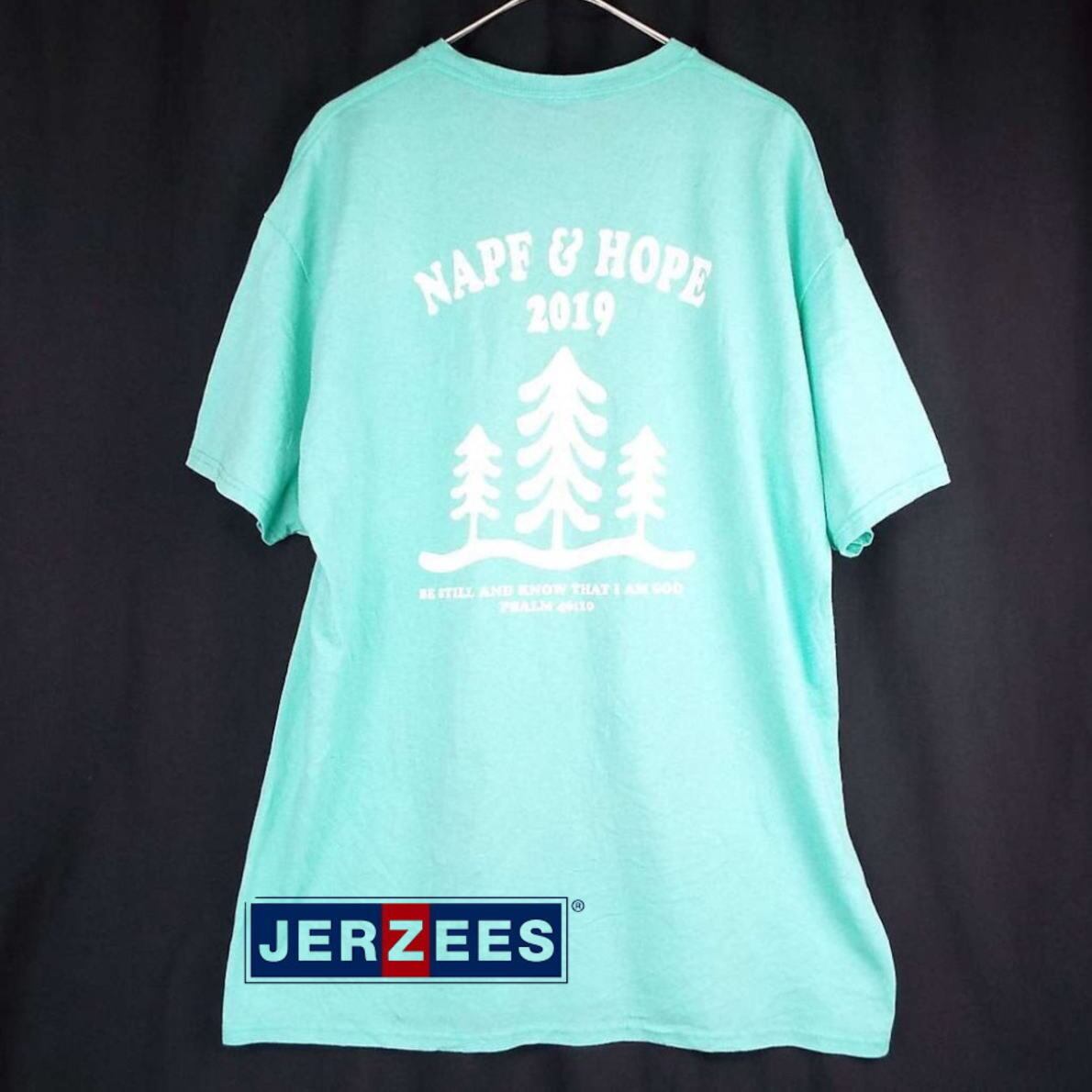 ☆肩幅55.5cm☆【Dri Power】JERZEES ジャージーズ BACK TO GOD NAPA&HOPE2019 両面プリント 半袖Tシャツ XLサイズ アイスグリーン コットンポリエステル混紡(50/50)【湘南倉庫】USアメリカ古着 T11 ビッグサイズ 4912345006325