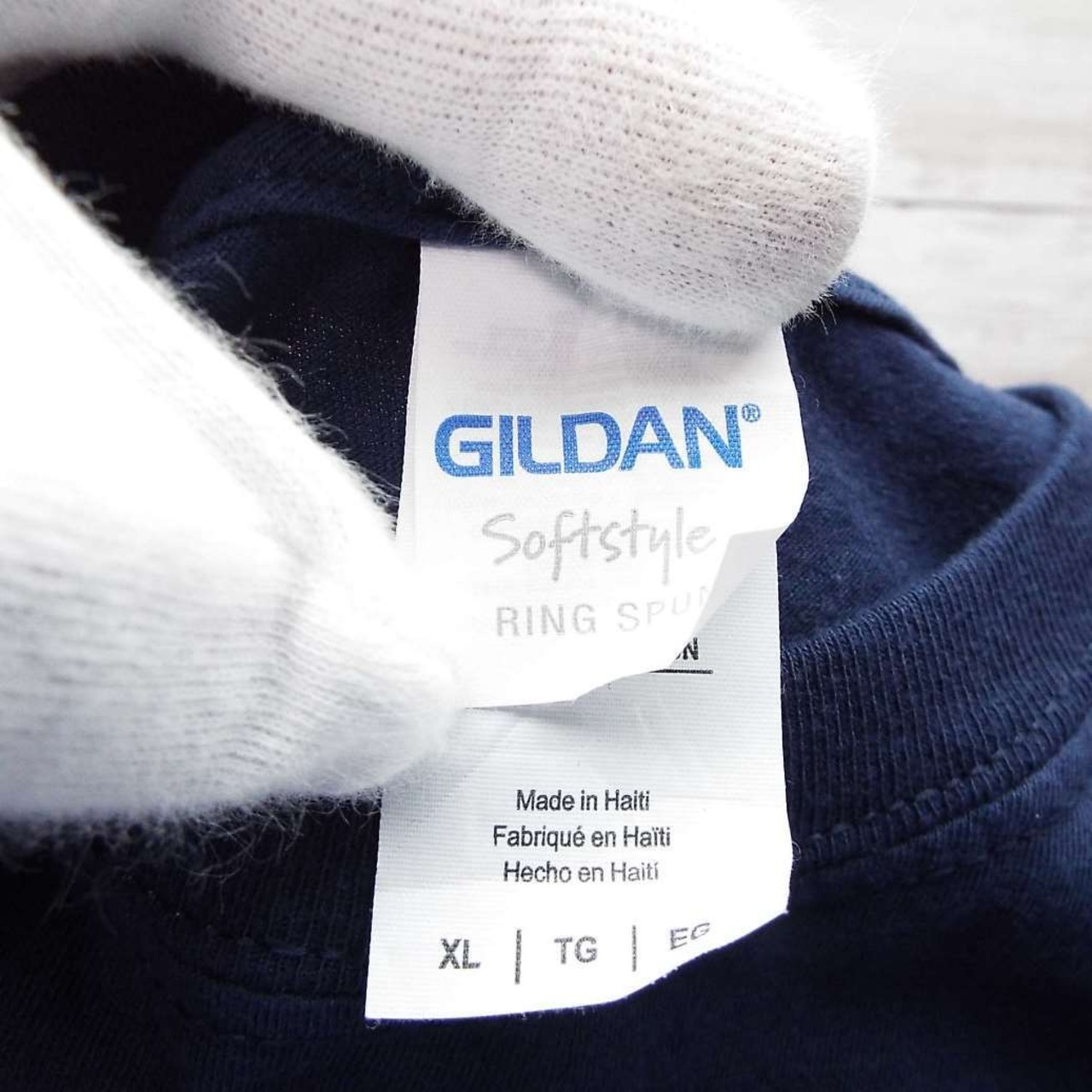 【肩幅51cm】GILDAN ギルダン MC BANK 英文字ロゴ 筆記体 softstyle 企業系 両面プリント 半袖Tシャツ XLサイズ コットン100% ネイビー 【湘南倉庫】アメリカ古着 ビッグサイズ