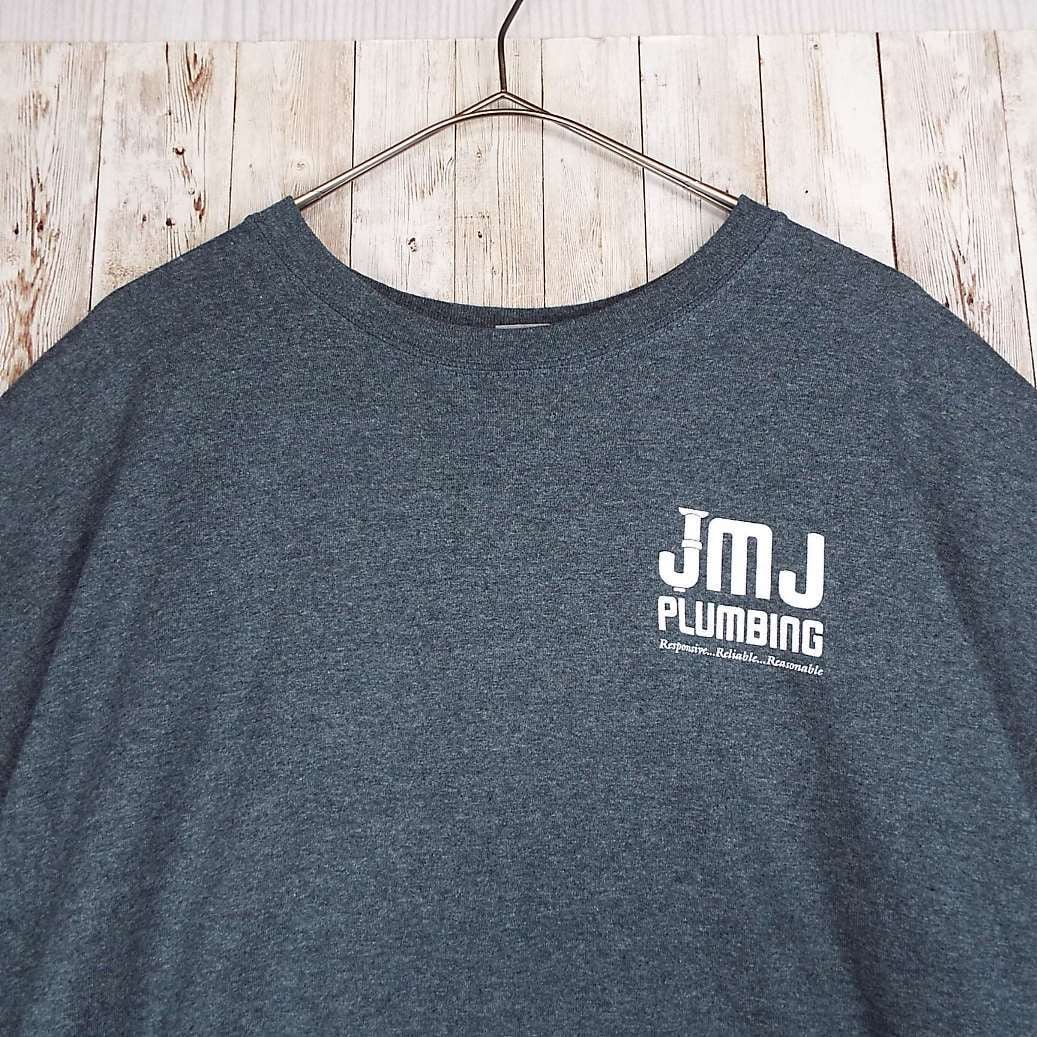 【肩幅59cm】【企業ロゴ】GILDAN ギルダン JMJ PLUMBING 大判ビッグロゴ 両面プリント 半袖Tシャツ 霜降りグレー 【湘南倉庫】USアメリカ古着 ビッグサイズ ULTRA COTTON
