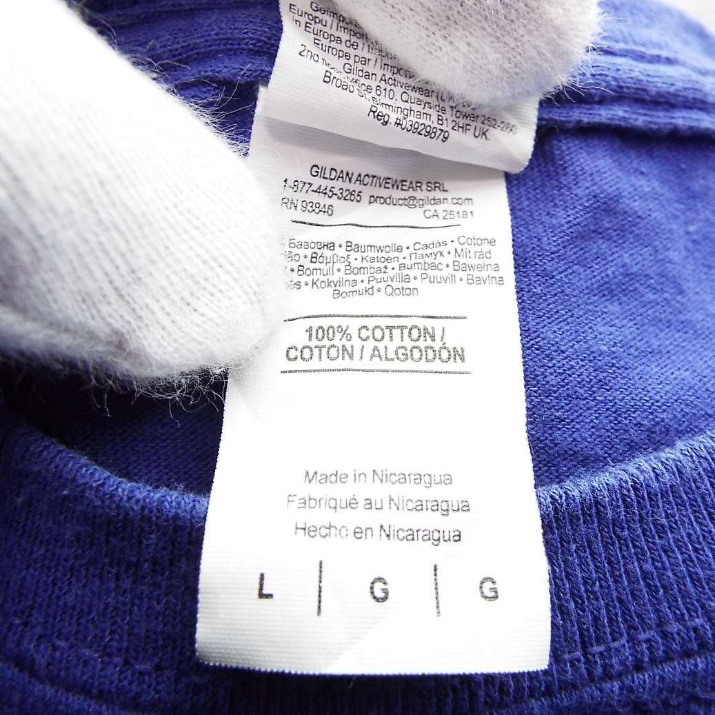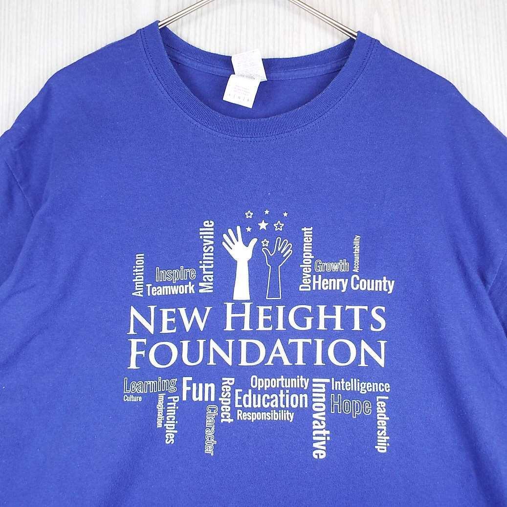 【肩幅53cm】GILDAN ギルダン NEW HEIGHTS FOUNDATION 英文字 企業系 グラフィックロゴ 両面プリント 半袖Tシャツ Lサイズ コットン100% ブルー【湘南倉庫】USアメリカ古着 HEAVY COTTON T16