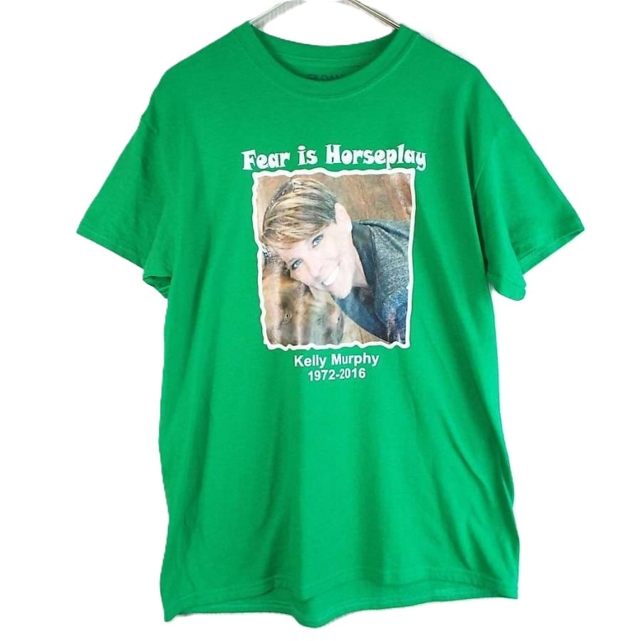 【顔写真プリント】GILDAN ギルダン Fear is Horseplay Kelly Murphy ラバープリント 両面プリント 女性 クルーネック 半袖Tシャツ Mサイズ(肩幅45.5cm)グリーン コットン・ポリエステル混紡【湘南倉庫】USメンズブランド古着