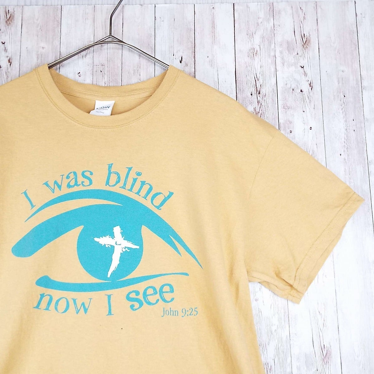 【肩幅48cm】GILDAN ギルダン I was blind now I see アイズ グラフィック レタード 年号 両面プリント 半袖Tシャツ Mサイズ ブラウンベージュ コットン100%【湘南倉庫】USメンズ古着 HEAVY COTTON T20