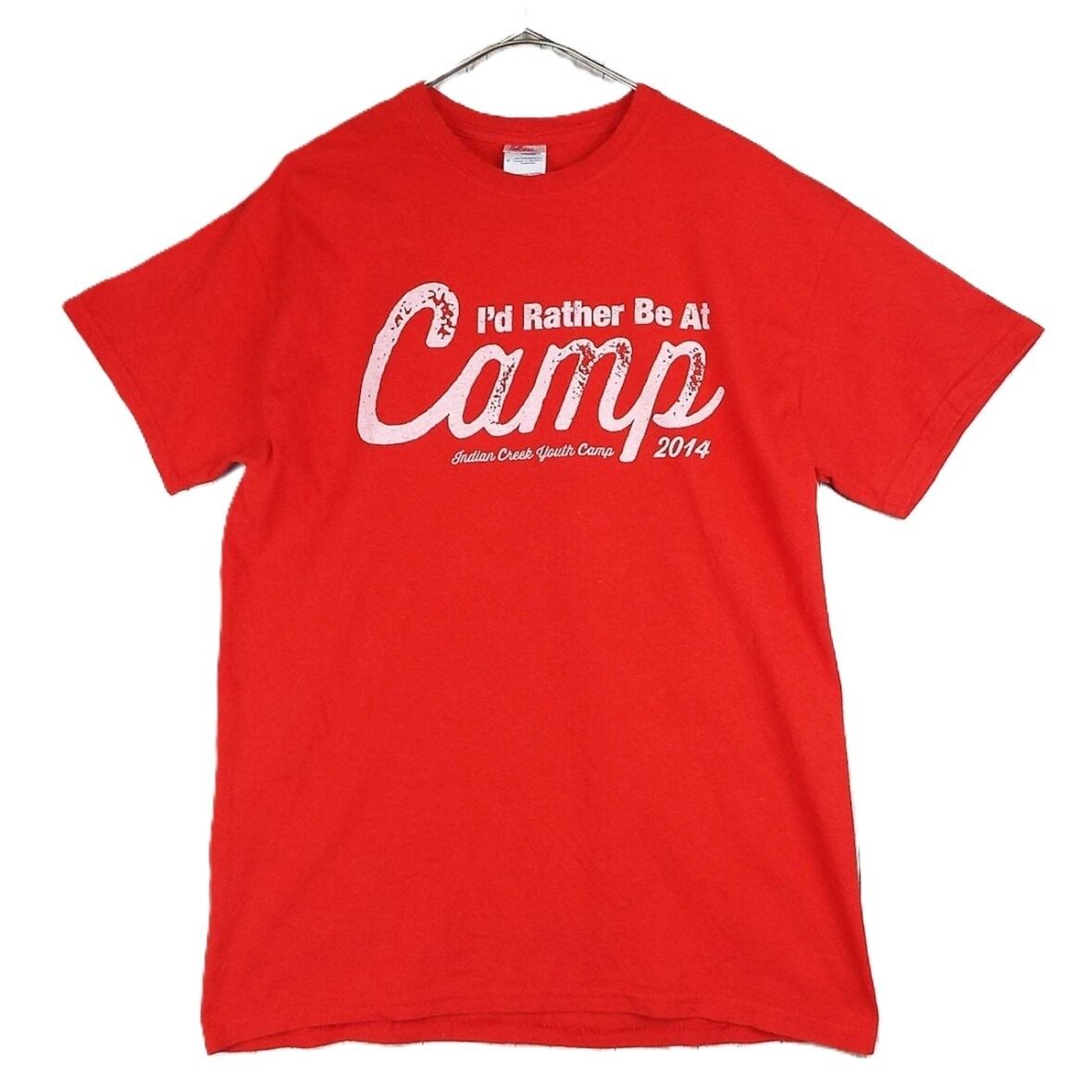 肩幅47cm【レタード】GILDAN ギルダン I’d Rather Be At Camp Indiana Creek Youth 2014 キャンプ 襟ネームあり 擦れ文字プリント 半袖Tシャツ Mサイズ レッド コットン100% 【湘南倉庫】USAメンズ古着 HEAVY COTTON T26