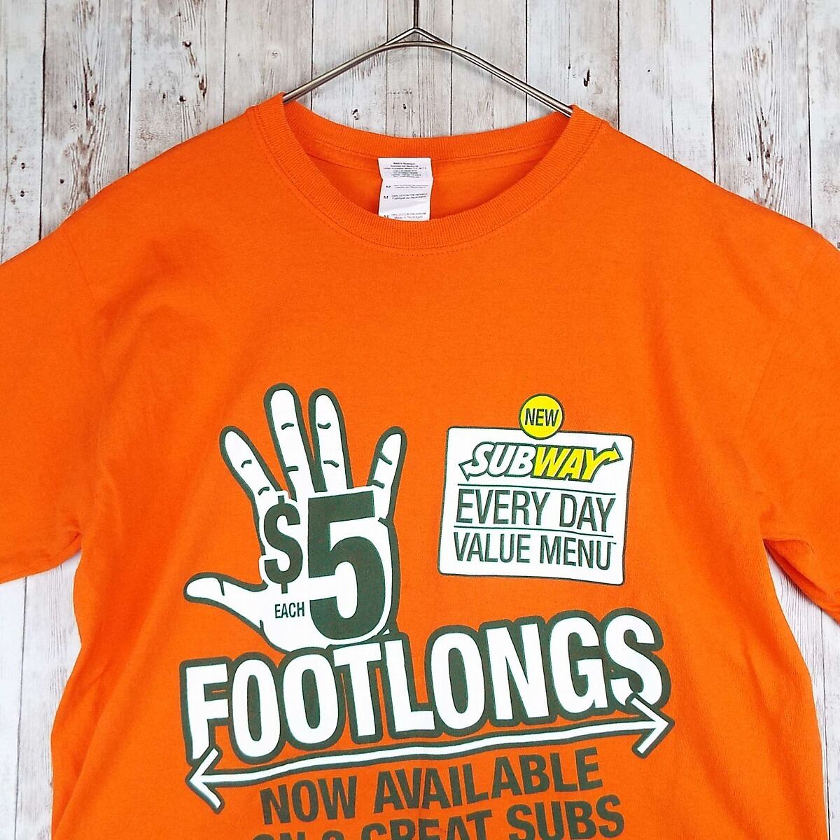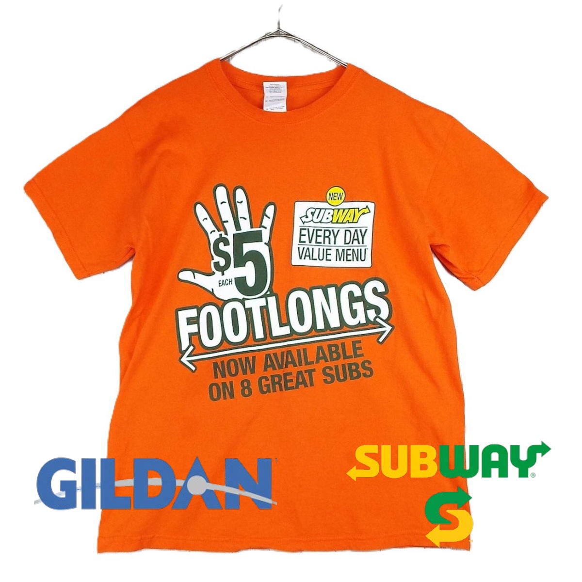 肩幅45cm【サブウェイオリジナル】00年代 GILDAN™ ギルダン SUBWAY 企業ショップロゴ プリント 半袖Tシャツ Mサイズ オレンジ コットン100% 【湘南倉庫】USAメンズ古着 T26 HEAVY COTTON