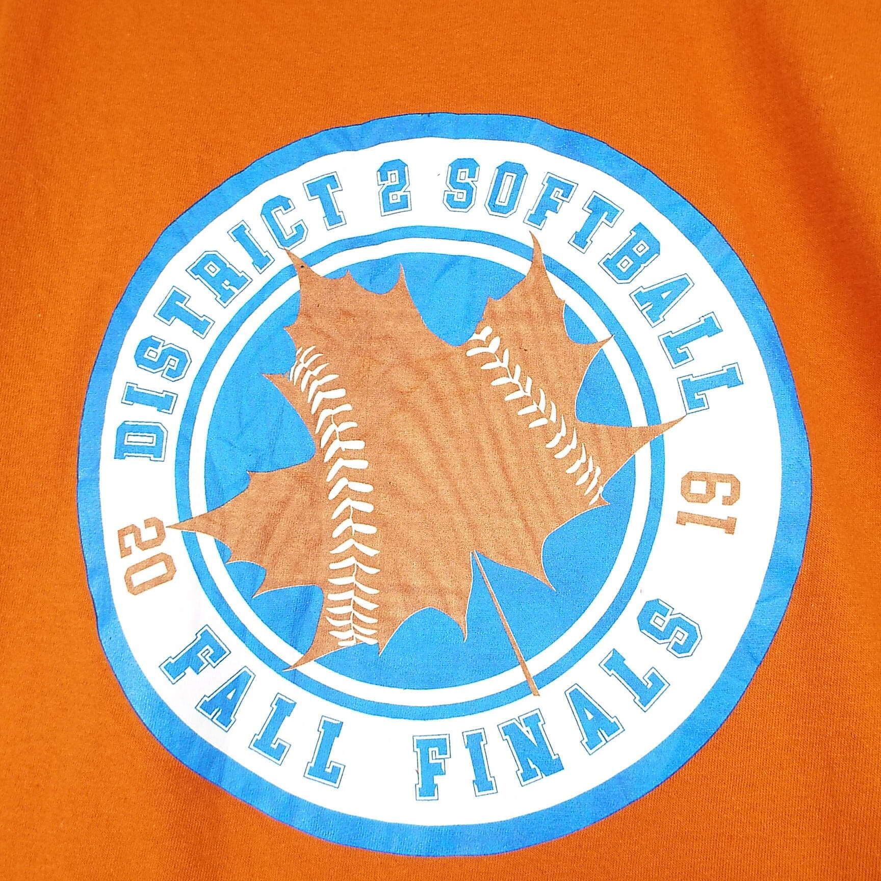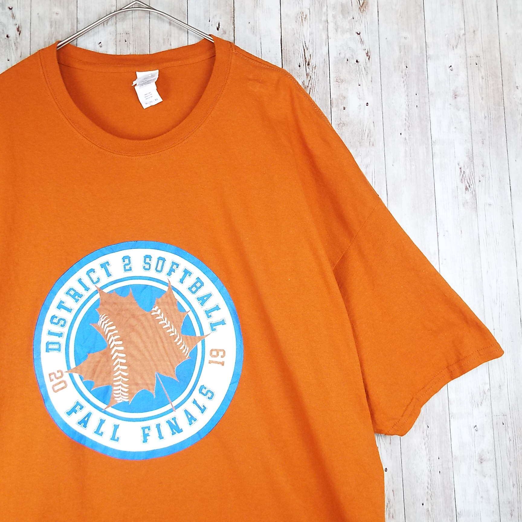 3XL|GILDAN DISTRICT 2 SOFTBALL FALL FINALS 2019 ラウンドロゴ ラバープリント 野球 グラフィック 前プリント 半袖Tシャツ オレンジブラウン US古着【湘南倉庫】ビッグサイズT