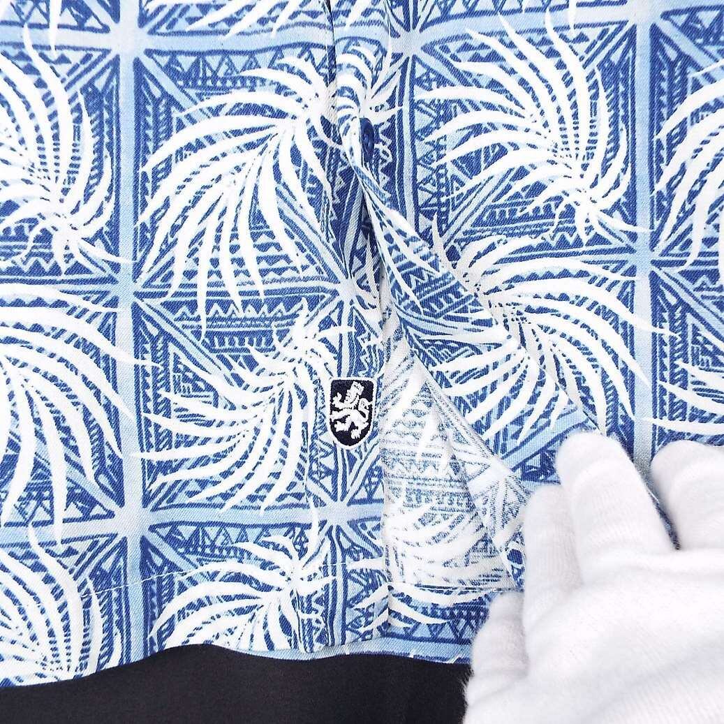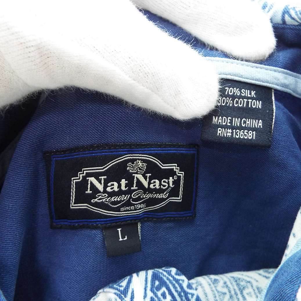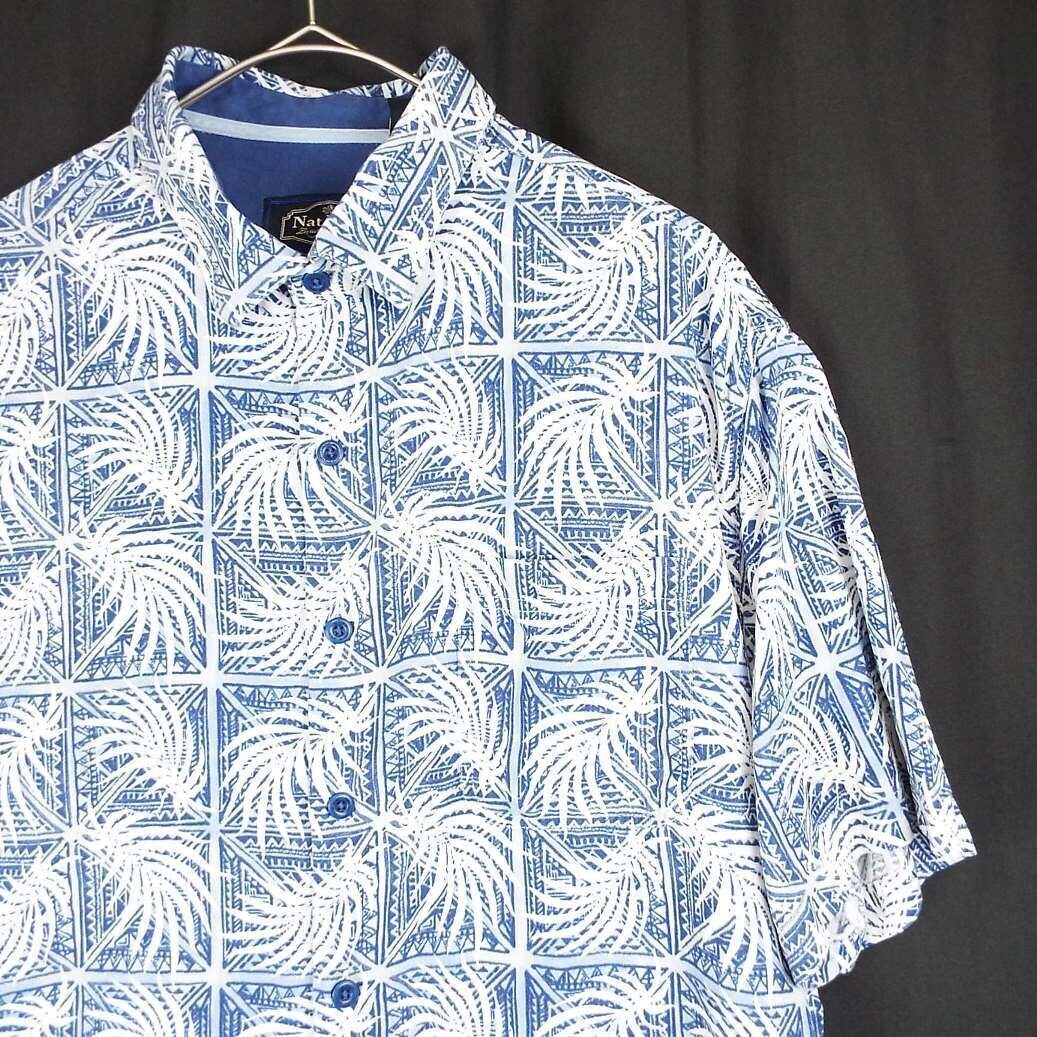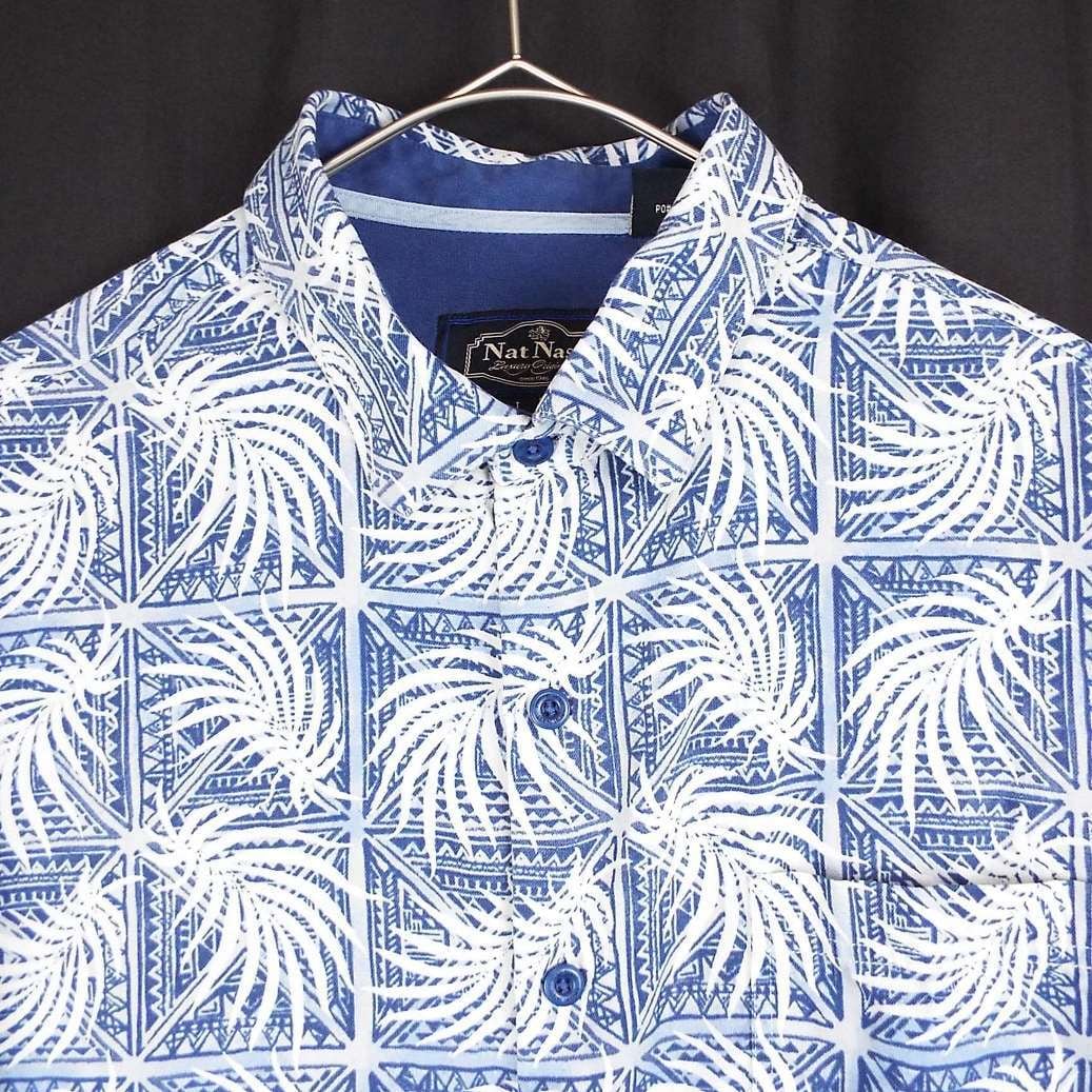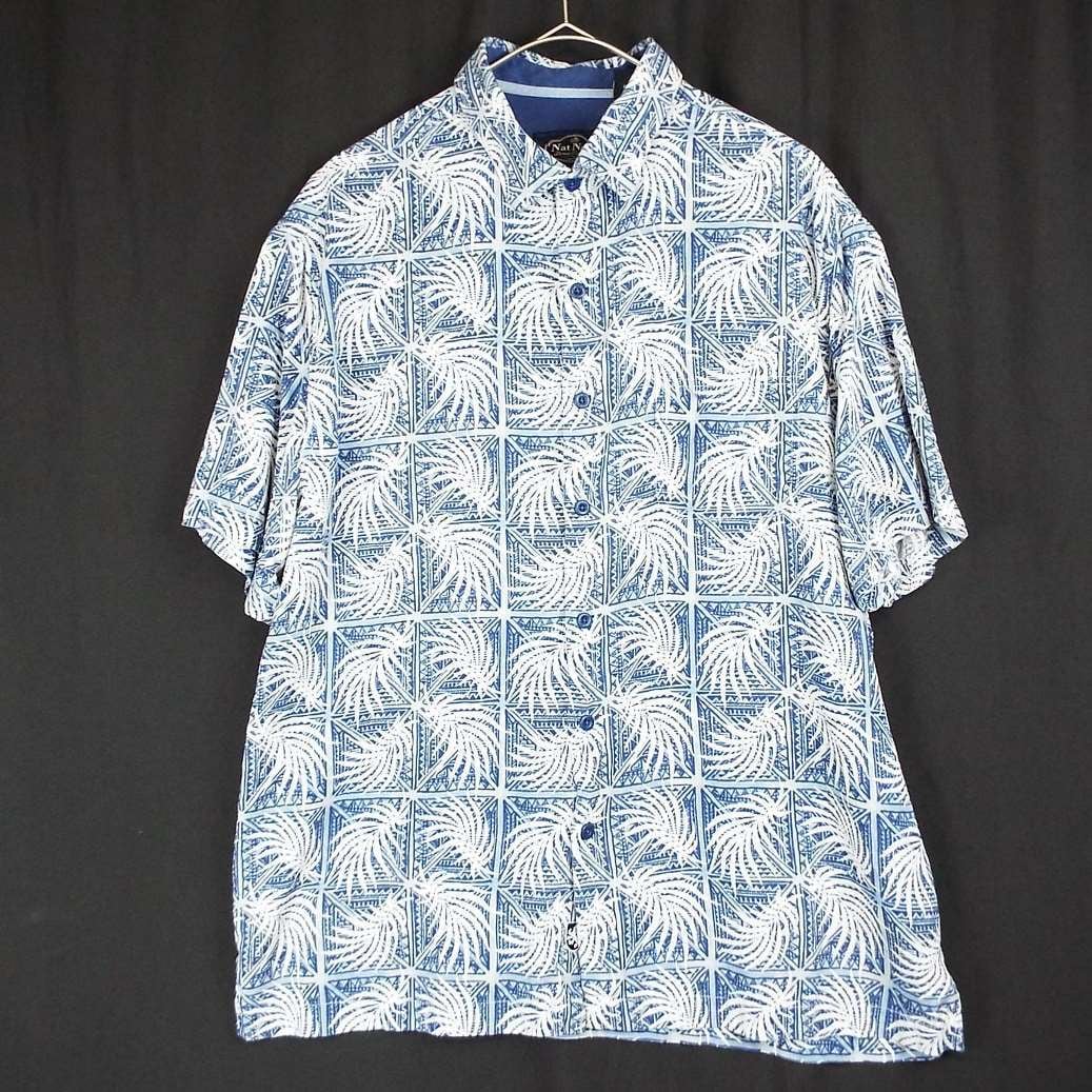 【肩幅50cm】Nat Nast® ナットナスト リーフ 総柄 ロゴ入りボタン 半袖シャツ Lサイズブルー・ホワイト シルク70% US古着【湘南倉庫】ビッグサイズ