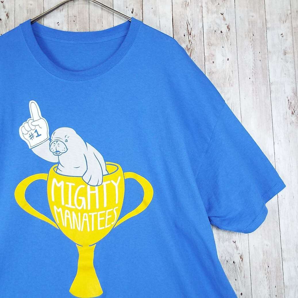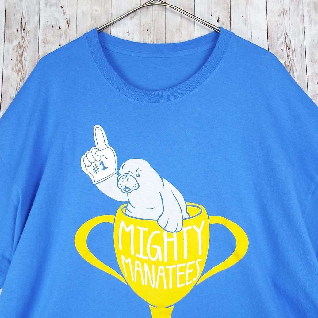 3XLサイズ|MIGHTY MANATEES 海牛 マナティ柄 動物 アニマル系 太陽 両面プリント 半袖Tシャツ ブルー コットン混 US古着【湘南倉庫】ビッグサイズT
