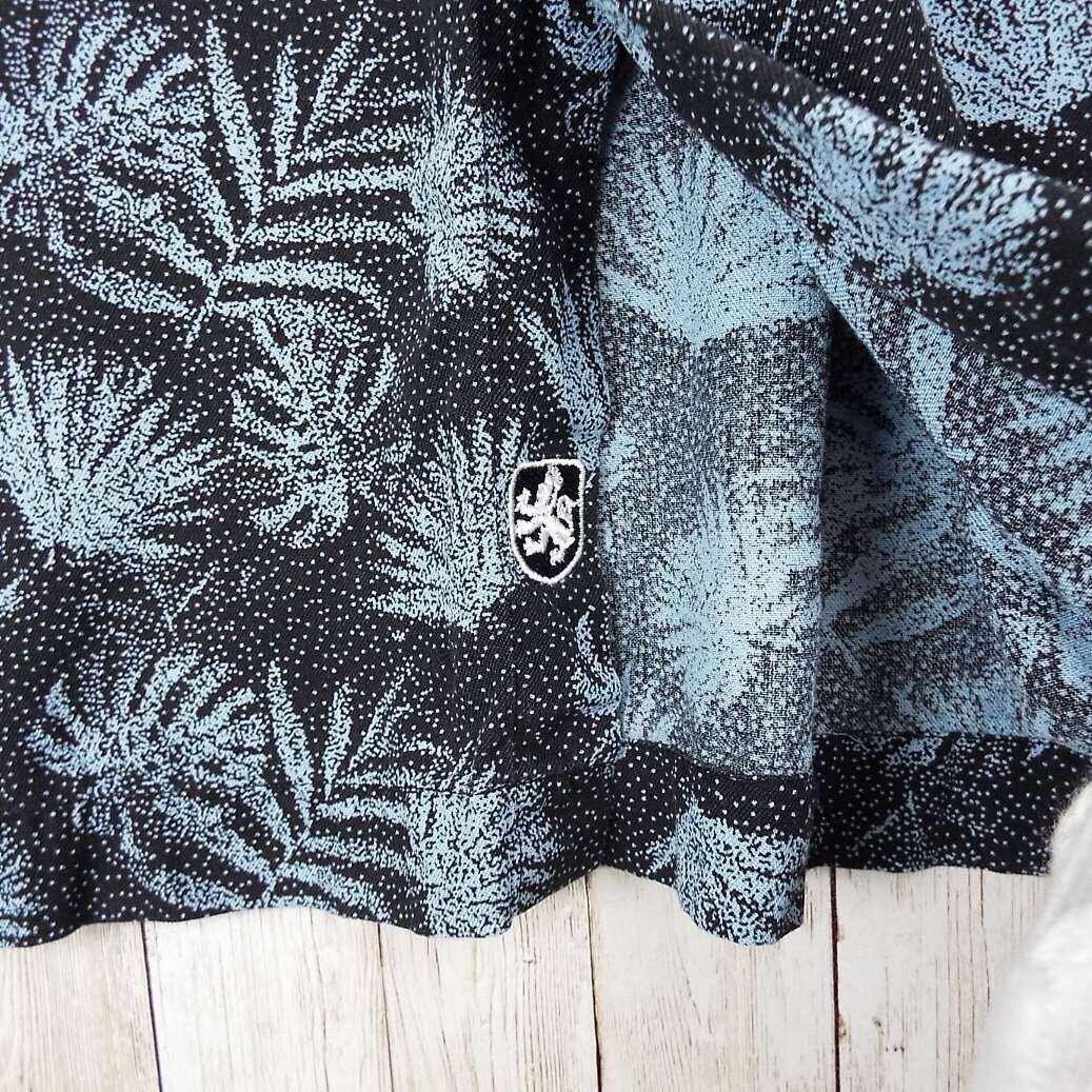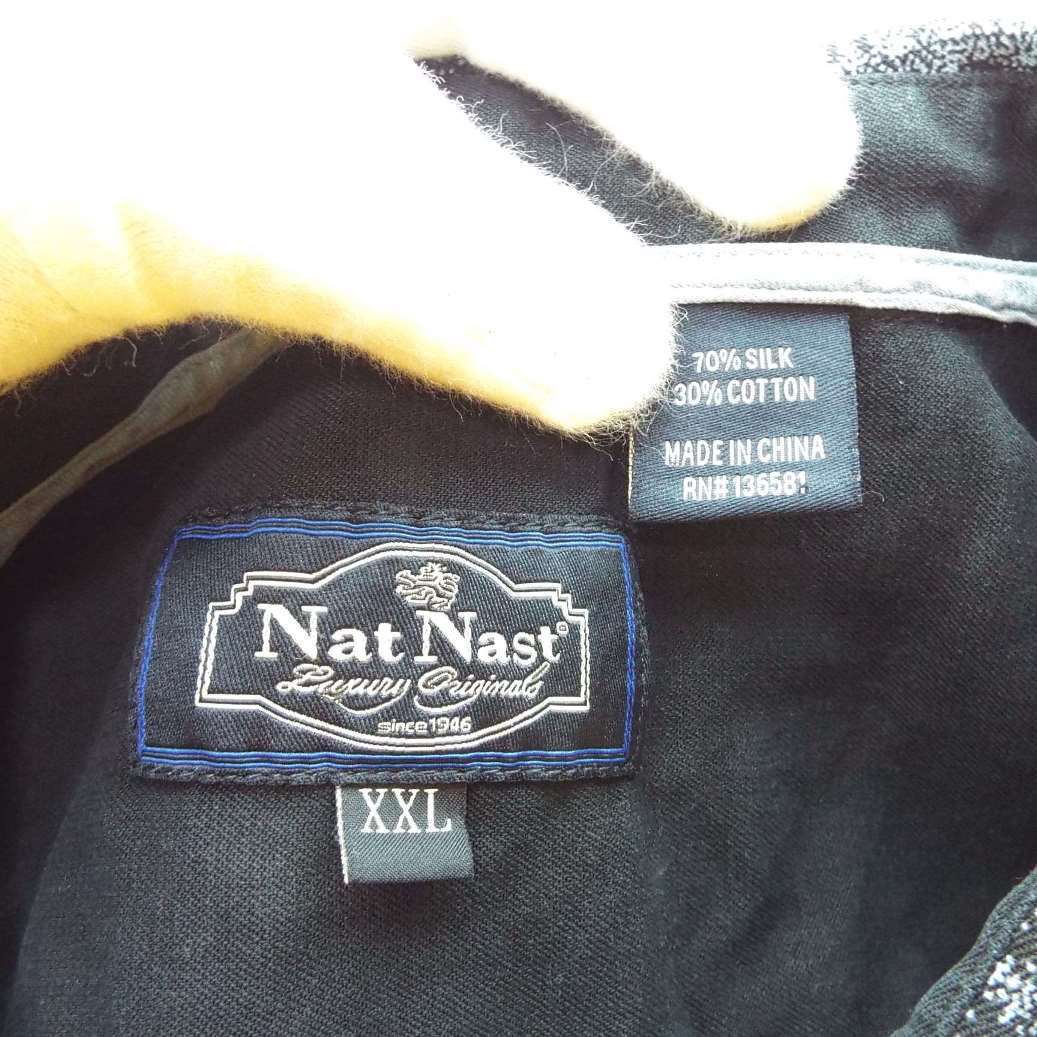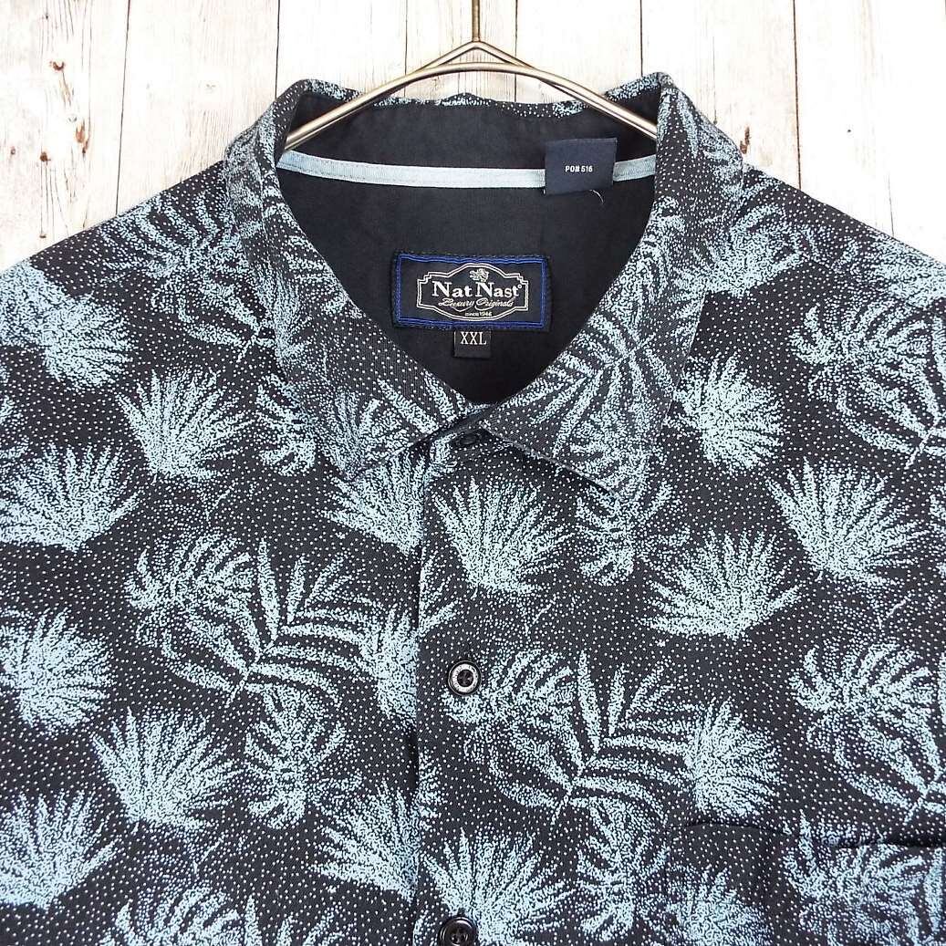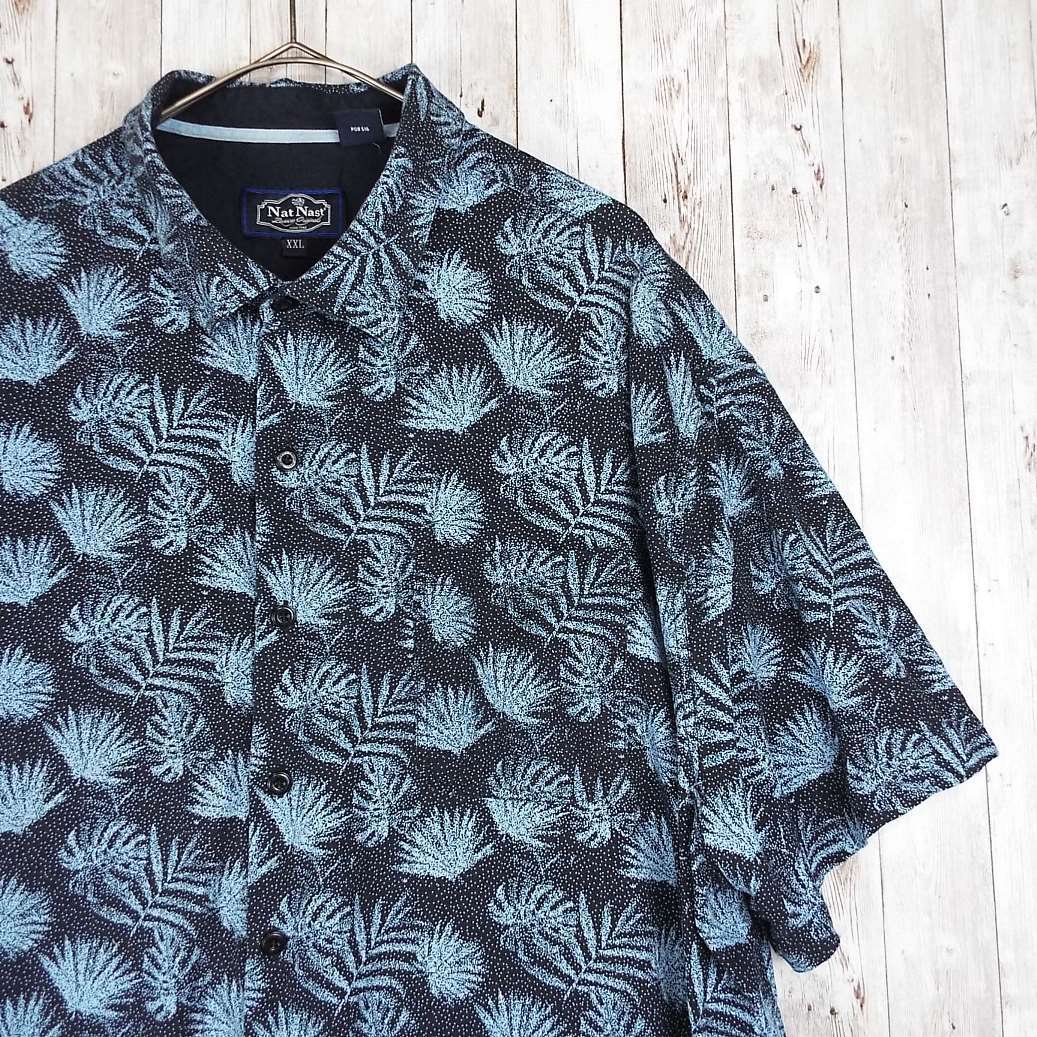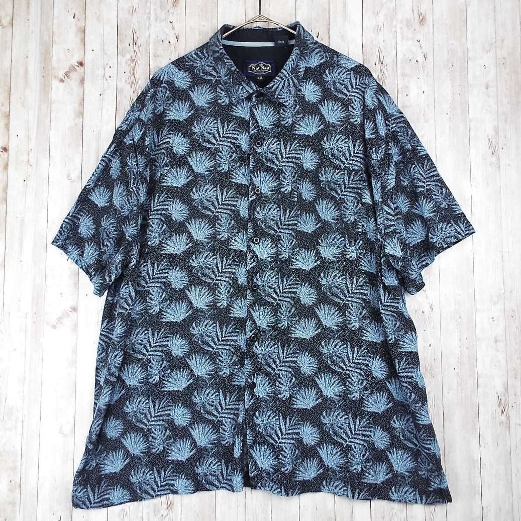 【肩幅57cm】Nat Nast® ナットナスト リーフ 総柄 ロゴ入りボタン 半袖シャツ XXL(2XL)ブラック・ブルー シルク70% 【湘南倉庫】USメンズ古着 ビッグサイズ ゆるだぼシャツ