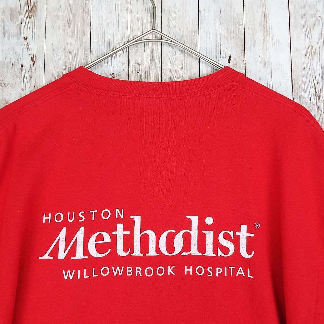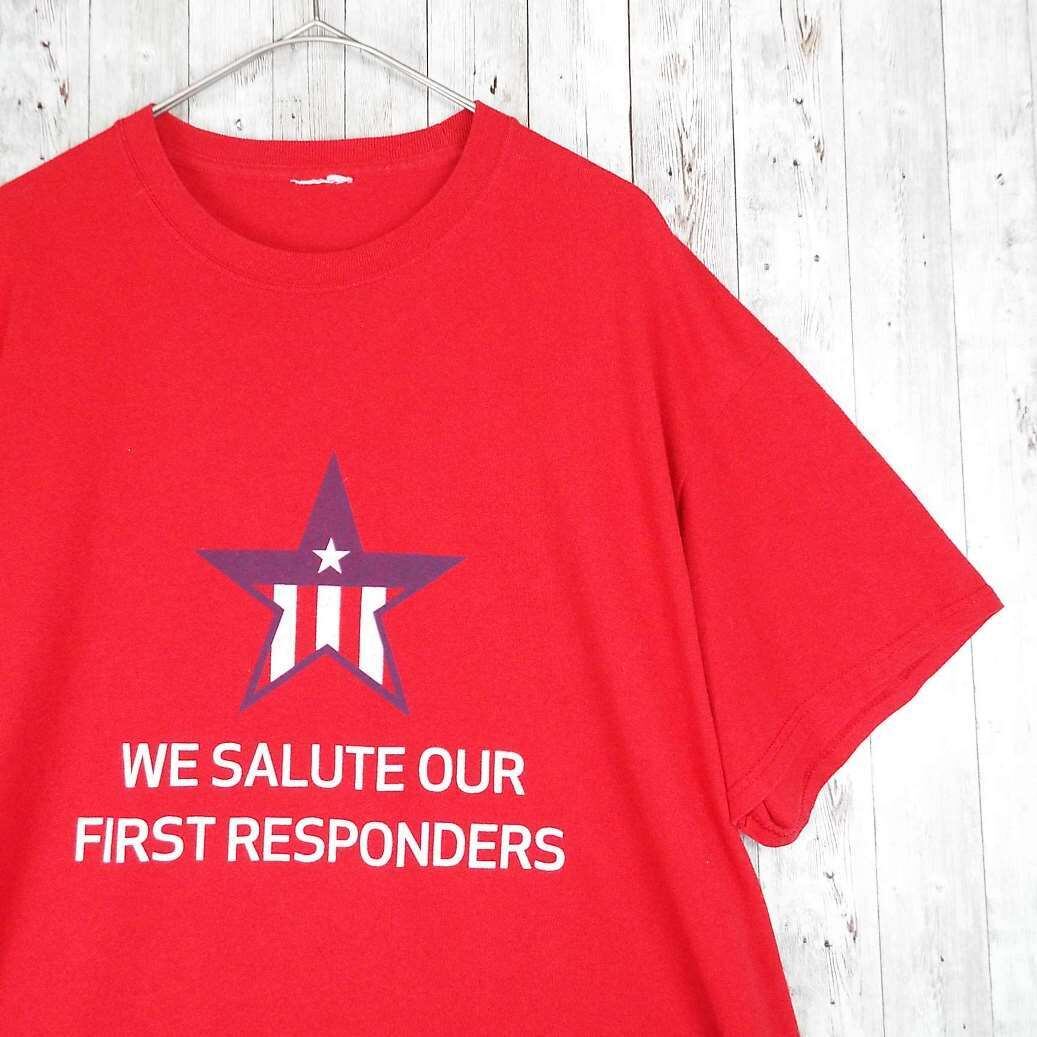 XLサイズ|WE SALUTE OUR FIRST RESPONDERS HOUSTON HOSPITAL 星条旗 病院 メッセージ 両面プリ 袖プリ 半袖Tシャツ レッド US古着【湘南倉庫】ビッグサイズT