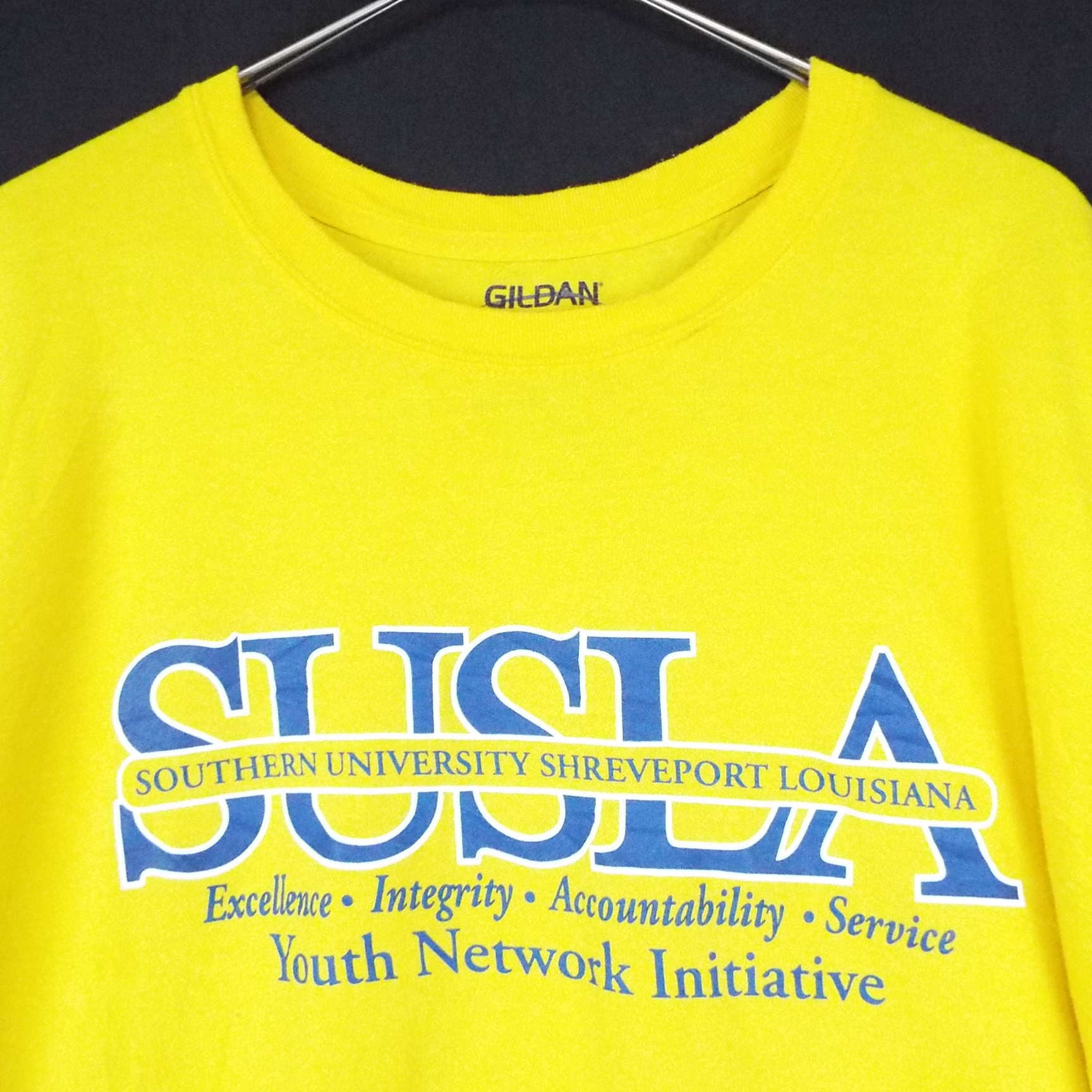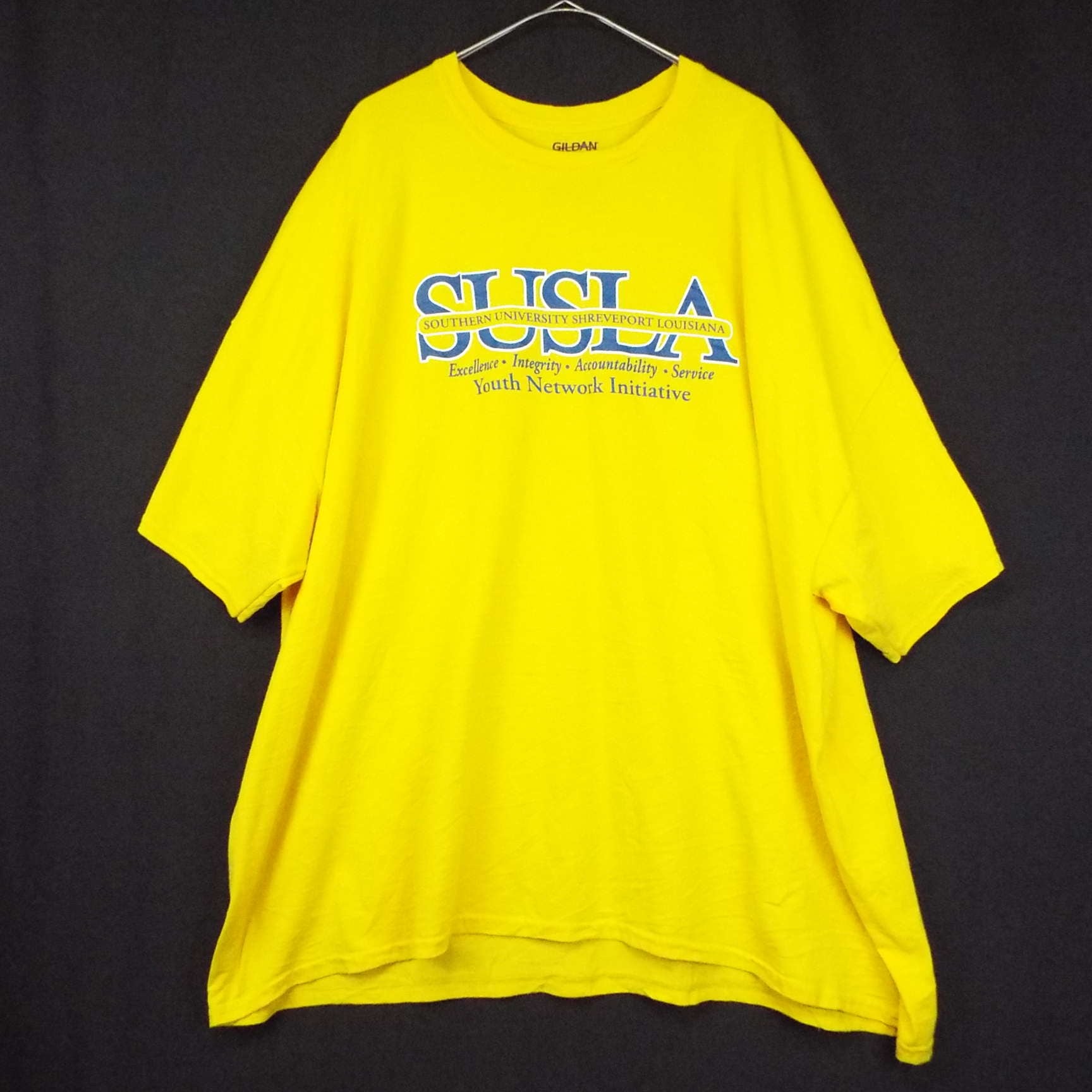 【肩幅76cm】GILDAN ギルダン SOUTHERN UNIVERSITY サザン・ユニバーシティ・アンド A&M大学 SHREVEPORT LOUISIANA 4段ロゴ 前プリント 半袖Tシャツ 4XLサイズ イエロー【湘南倉庫】ビッグサイズ ゆるだぼ T50