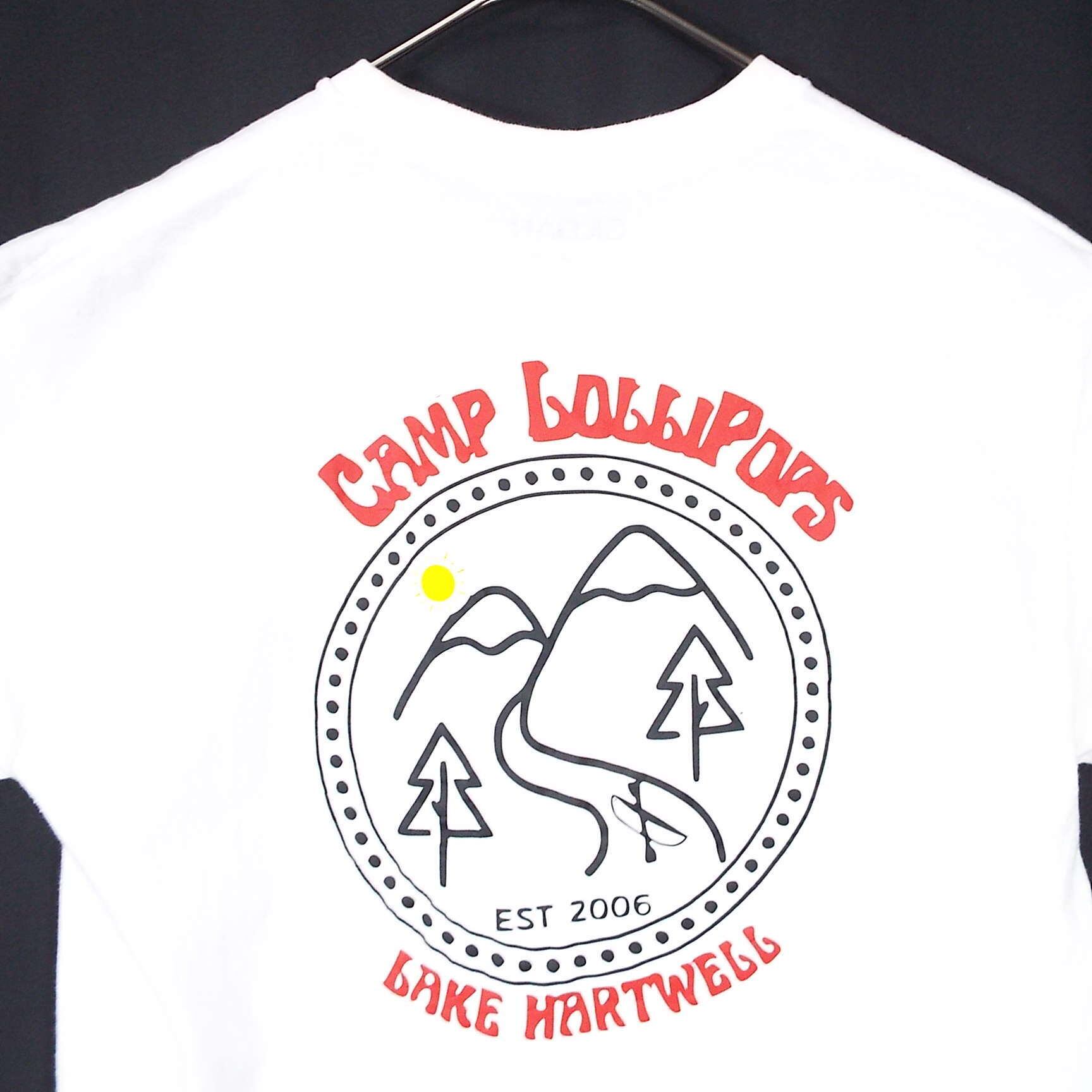 【肩幅46cm】GILDAN ギルダン CAMP LOLLIPOPS LAKE HARTWELL 2006 キャンプ アウトドア 胸ロゴ 両面プリント 大判ロゴ 半袖Tシャツ Mサイズ ホワイト コットン100% US古着【湘南倉庫】メンズサイズ 白Tシャツ