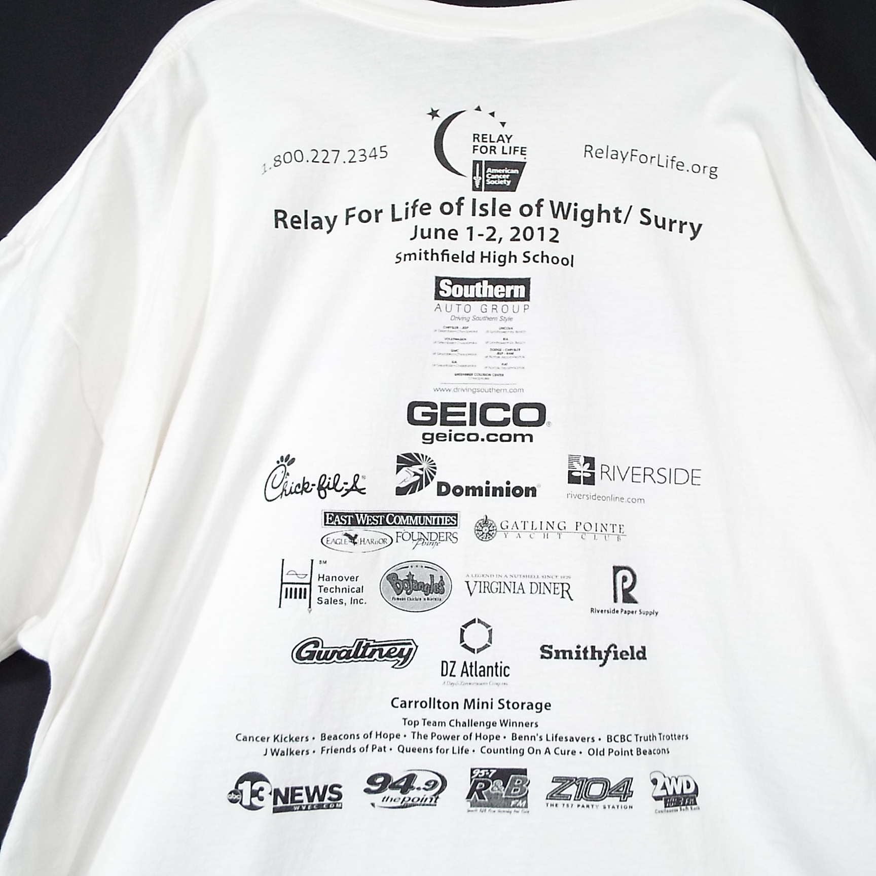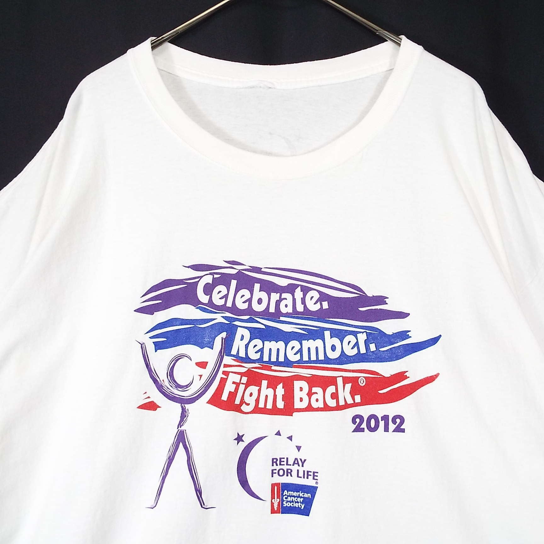 ◎肩幅71cm◎【グラフィックデザイン】RELAY FOR LIFE American Cancer Society 2012 企業スポンサーロゴ 両面プリント 半袖Tシャツ 3XLサイズ ホワイト 【湘南倉庫】USA古着 ゆるだぼ T43