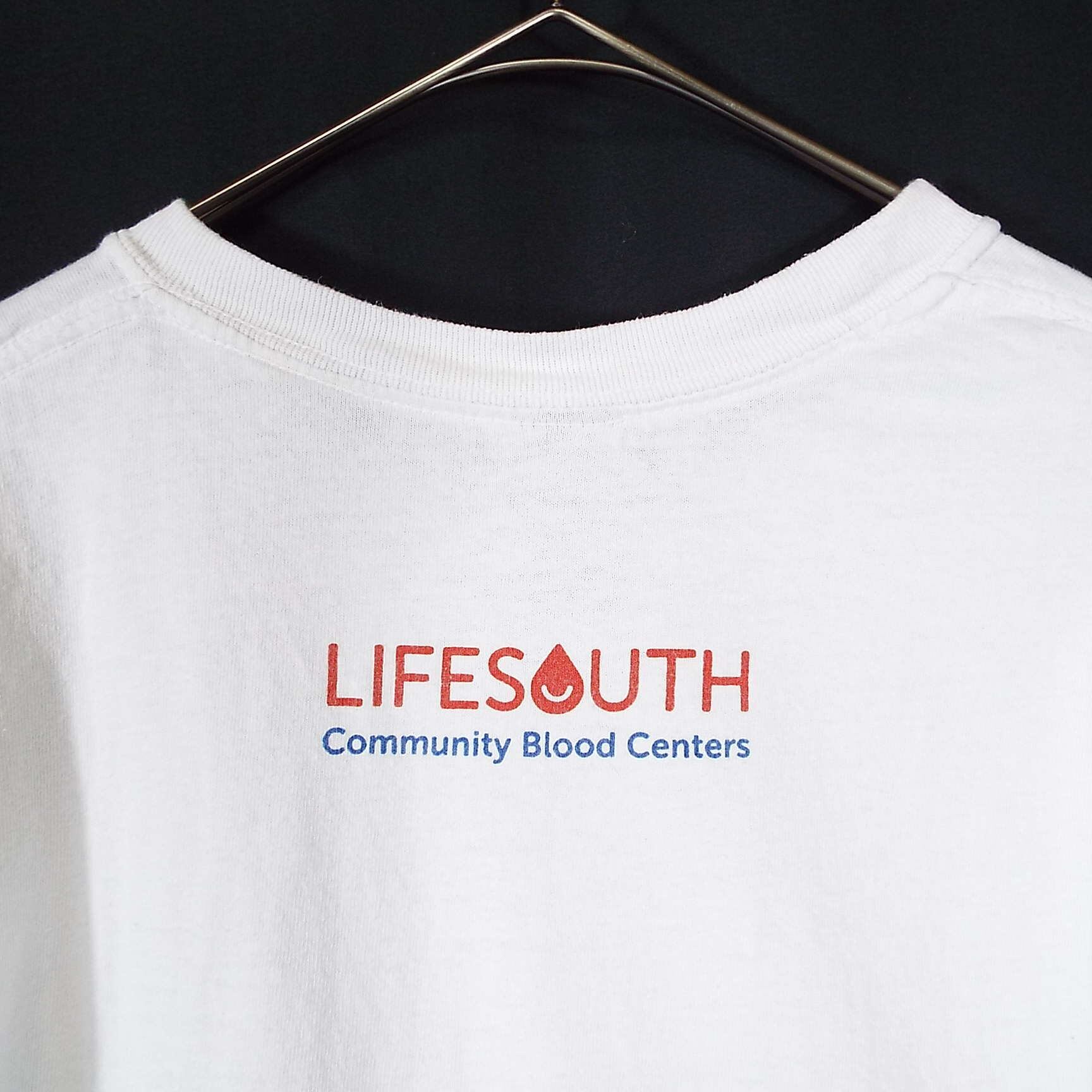 【SOLD OUT】◎肩幅53.5cm◎【グラデーションロゴ】GILDAN ギルダン Blood Donor レインボー 斜めロゴ 両面プリント 半袖Tシャツ Lサイズ ホワイト コットン100% US古着【湘南倉庫】USA古着 T43 HEAVY COTTON