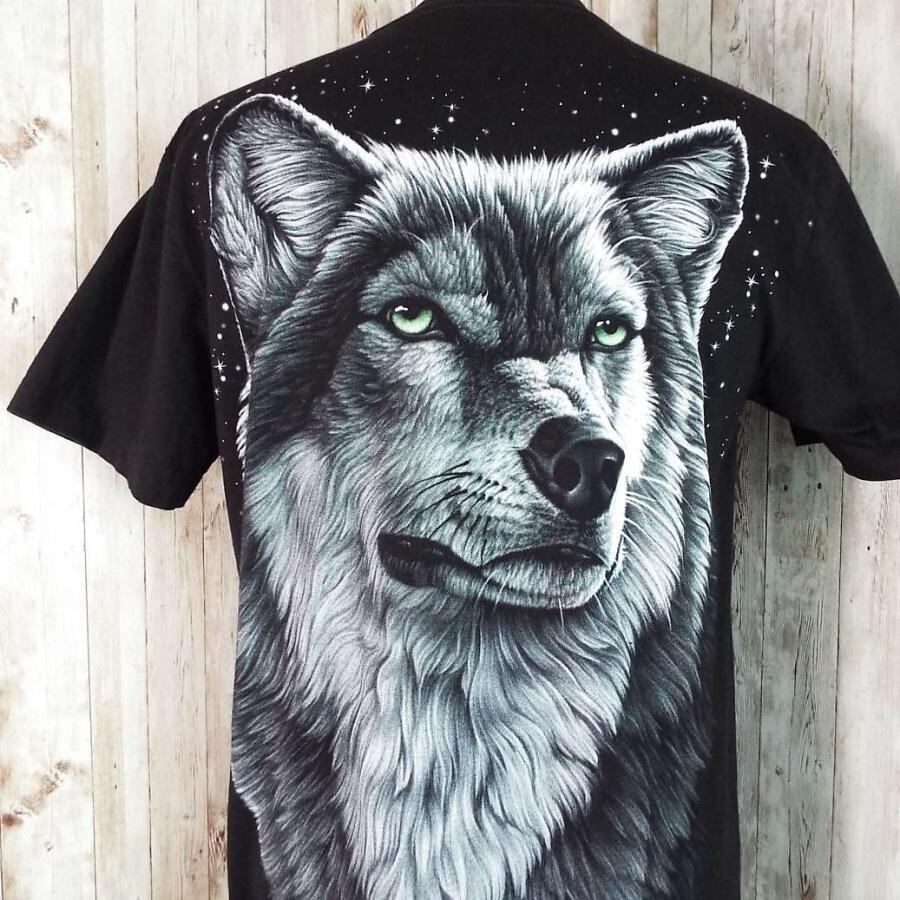 【肩幅41cm】♪アニマルTシャツ♪anial print wolf オオカミ 狼 ウルフ 動物 両プリント 半袖Tシャツ Sサイズ ブラック【湘南倉庫】アメリカ古着 カラーシャツ 大判プリント T5
