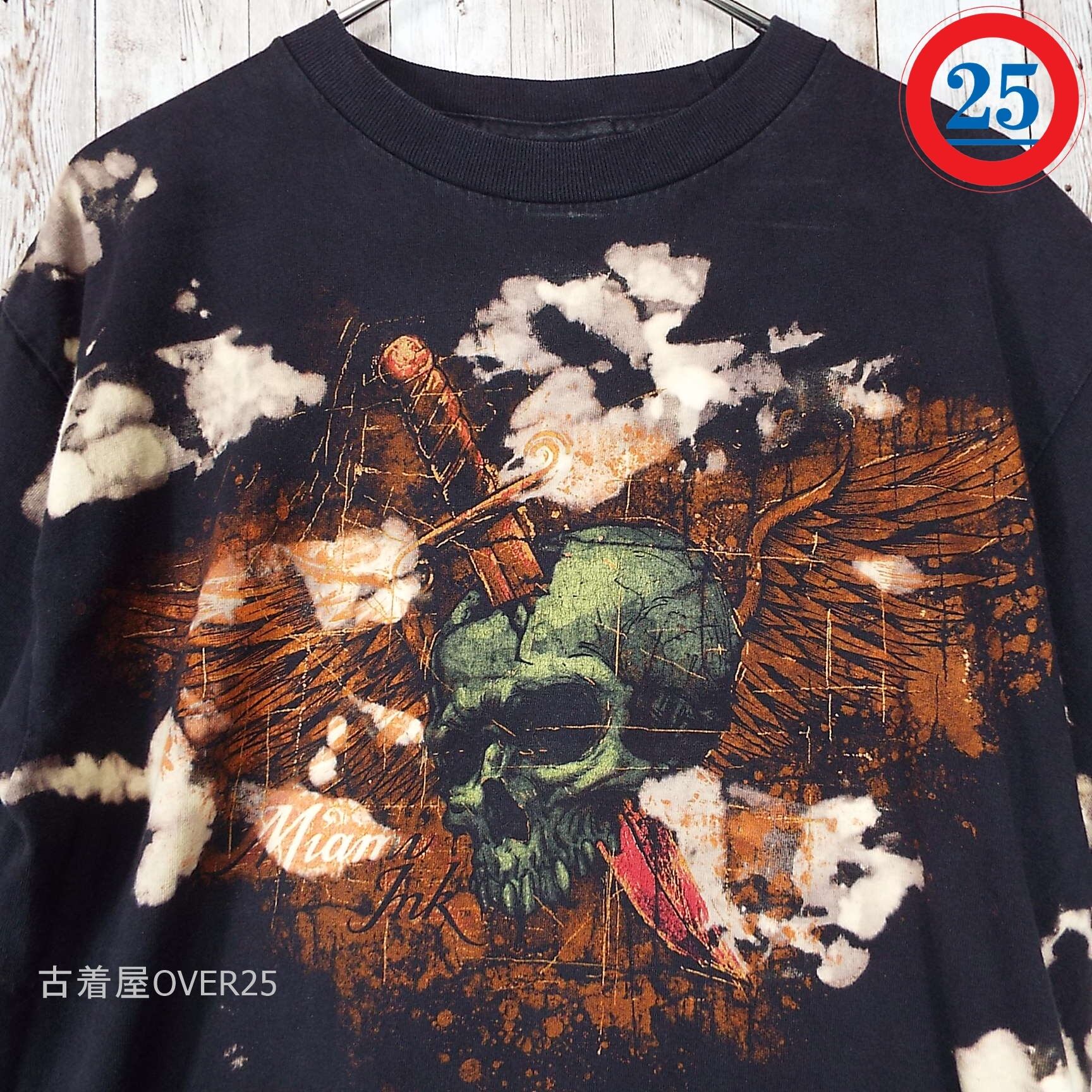 Mサイズ|00's メキシコ製 Miami Ink 骸骨 ガイコツ ドクロ スカル スプラッター 剣 グラフィック クールネック 半袖Tシャツ ブラック【湘南倉庫】タイダイ染・ブリーチTシャツ