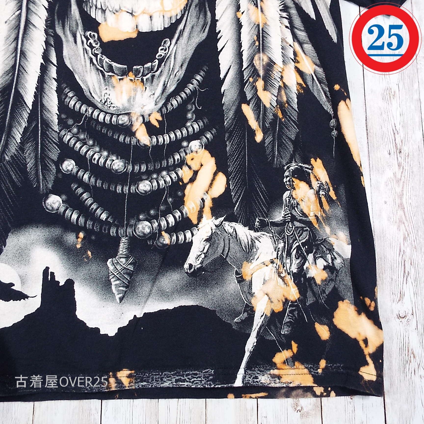 Sサイズ|00's FRUIT OF THE LOOM インディアン 骸骨 ガイコツ ドクロ スカル 大判 クールネック 半袖Tシャツ ブラック【湘南倉庫】タイダイ染・ブリーチ