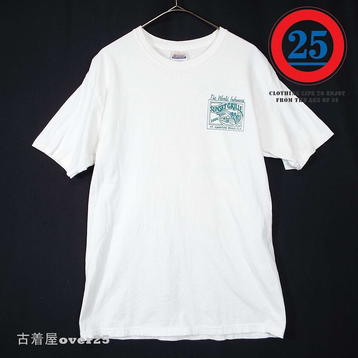Mサイズ|Hanes SUNSET GRILLE ST.AUGUSTINE BEACH FL 海辺 夕日 ヨット クールネック 半袖Tシャツ ホワイト【湘南倉庫】白Tシャツ 大判プリント