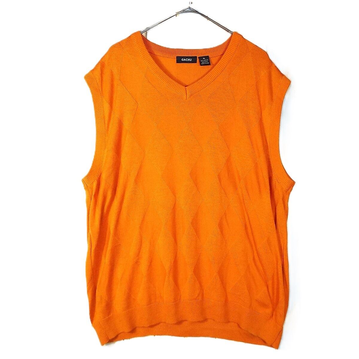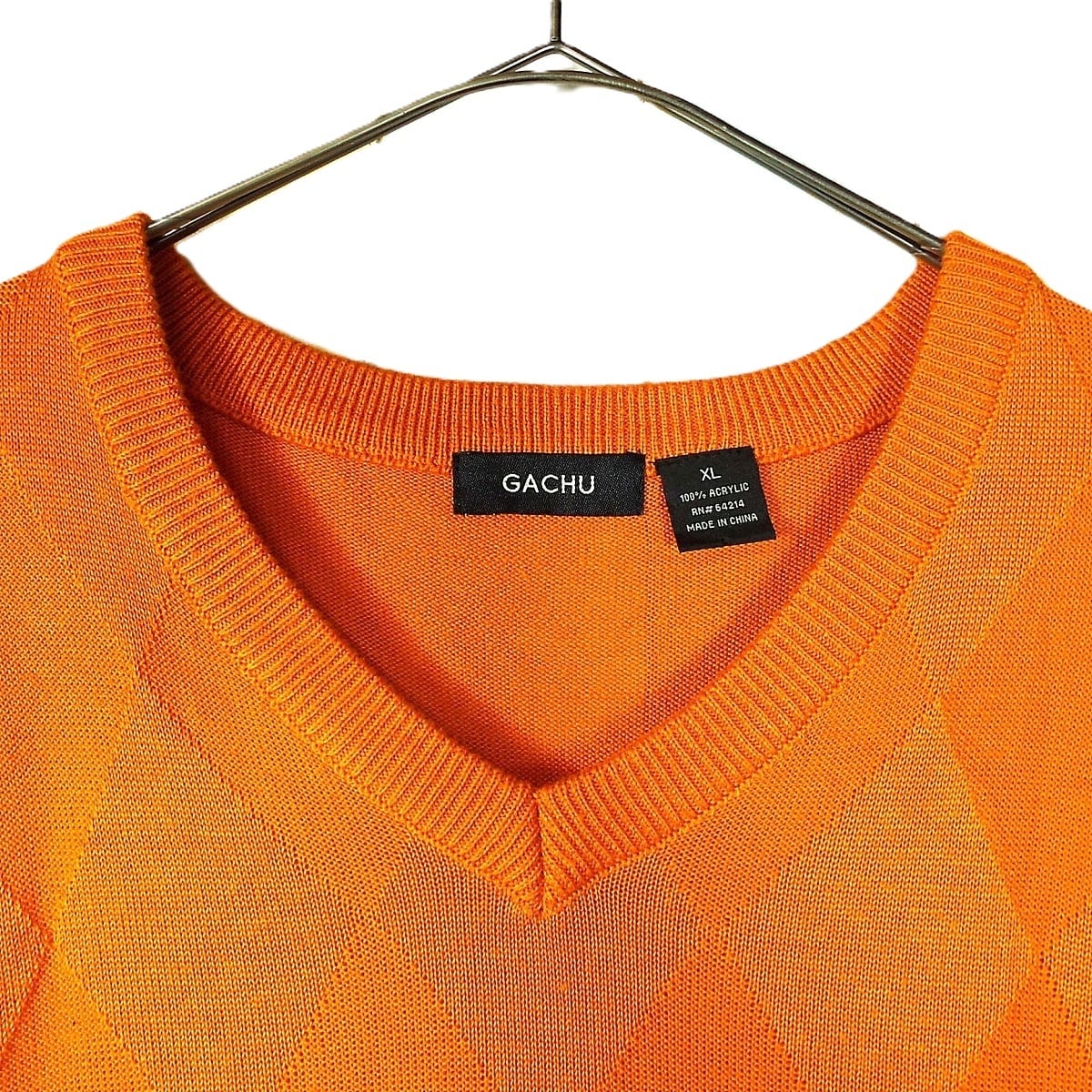 【肩幅48cm】GACHU ガチュー 透かしアーガイル柄 Vネック ニットベスト オレンジ橙 XLサイズ アクリル100%【湘南倉庫】USメンズ古着 14000836