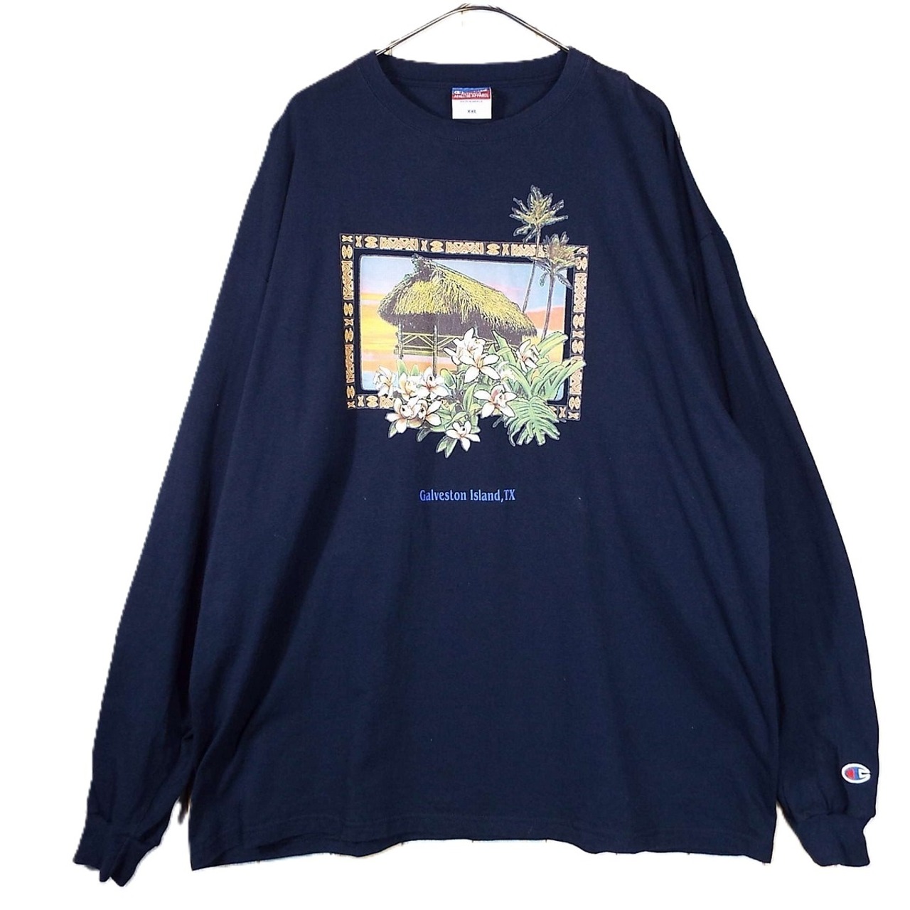【ネイティブ柄】メキシコ製 Champion チャンピオン calveston Island 袖パッチロゴ 大判プリント クルーネック 長袖Tシャツ(ロンT) XXLサイズ(肩幅63cm)ダークネイビー【湘南倉庫】USメンズブランド古着 オーバシルエット
