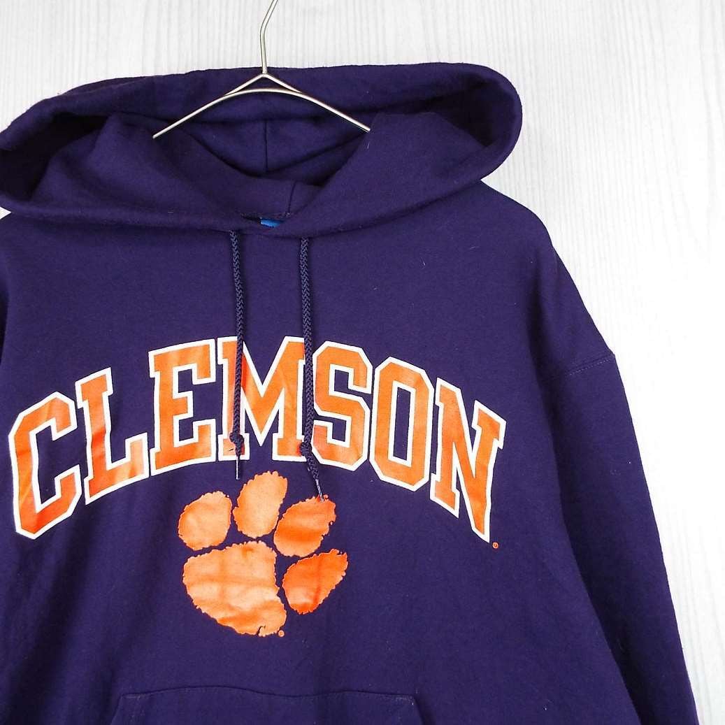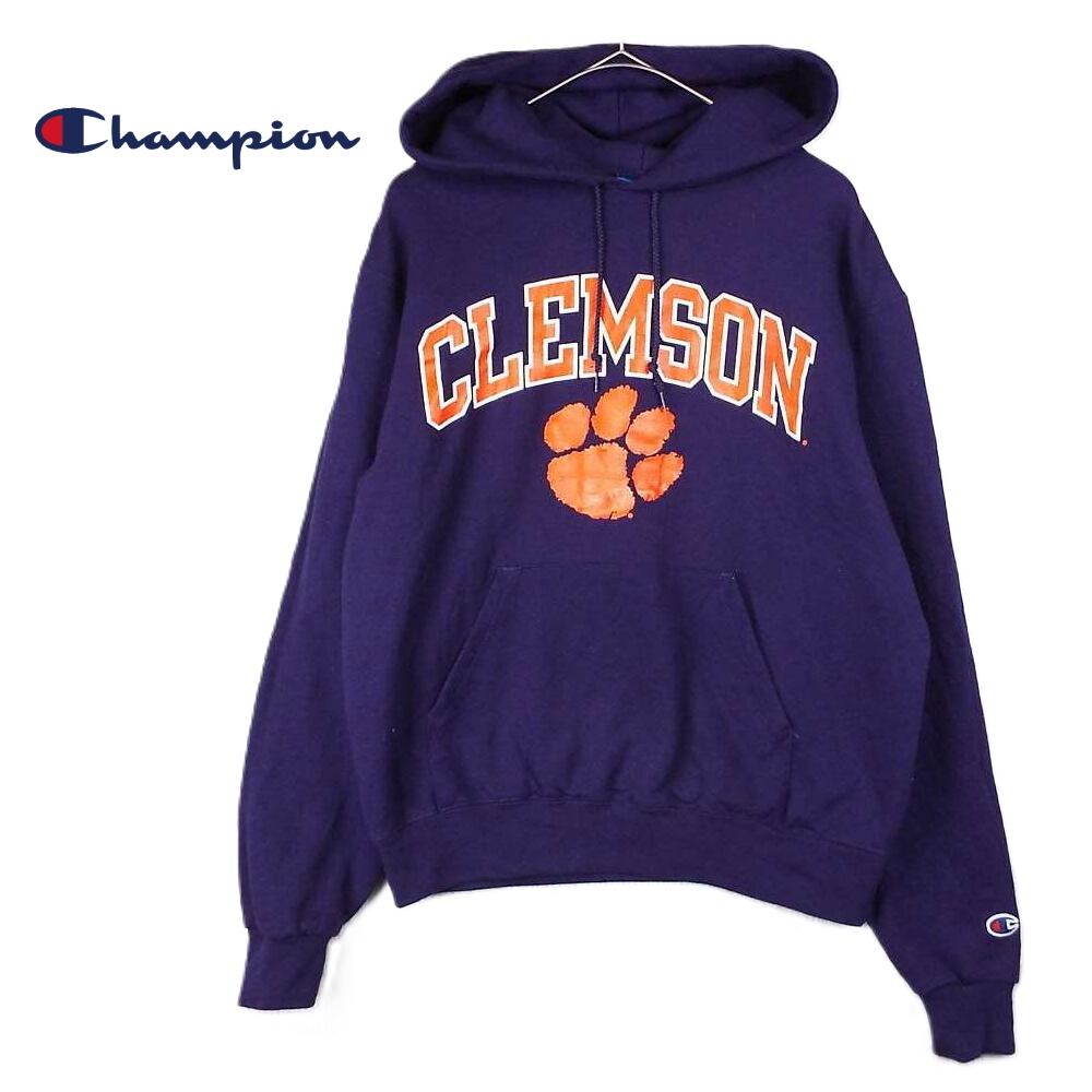 素敵なカレッジロゴ チャンピオン Champion CLEMSON大学 袖パッチロゴ 目あり 長袖パーカー フーテッド スウェット Sサイズ パープル紫【湘南倉庫】USメンズ古着 4912345005090