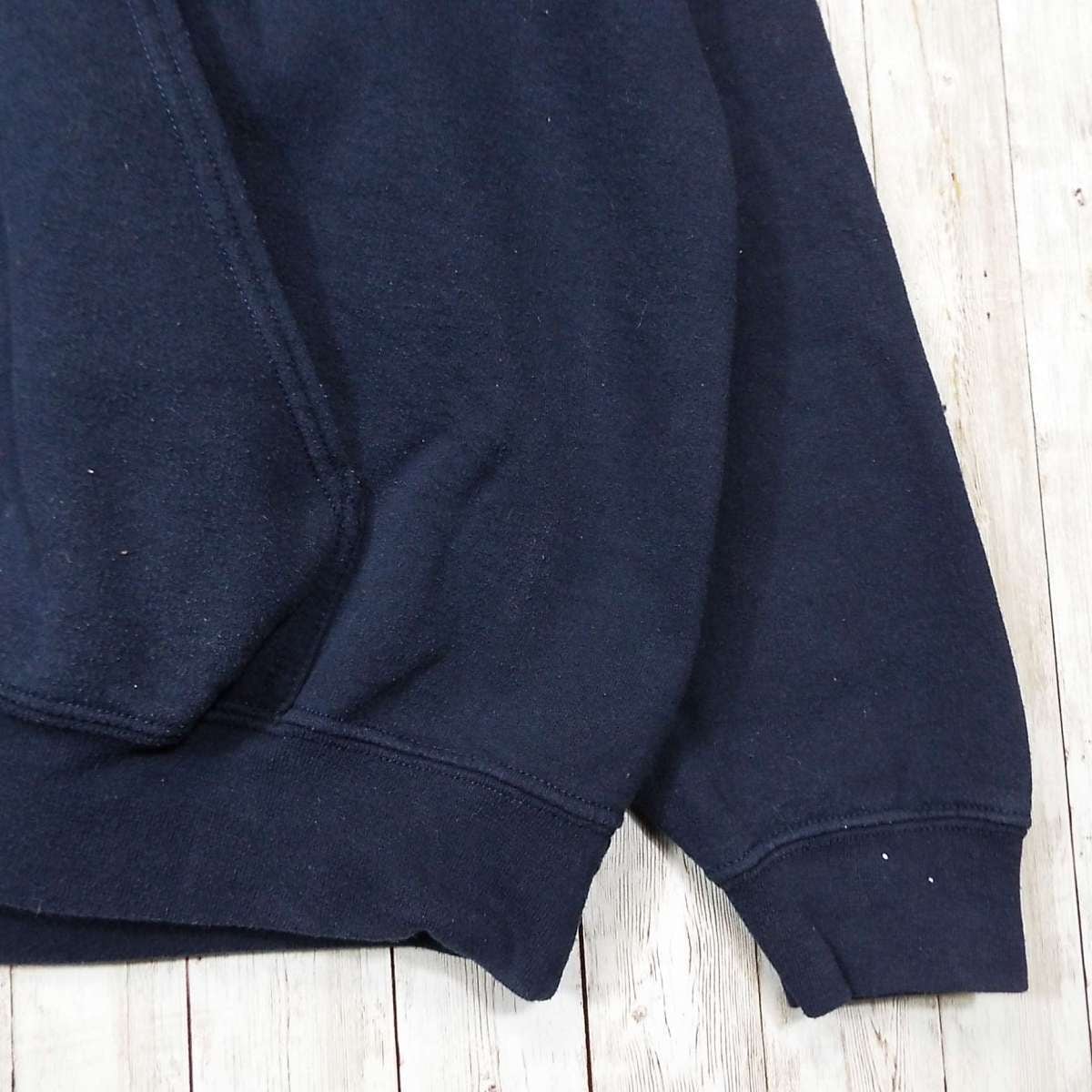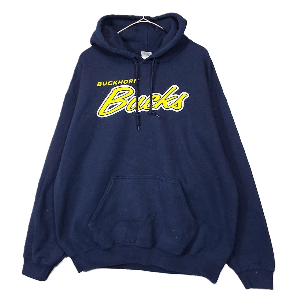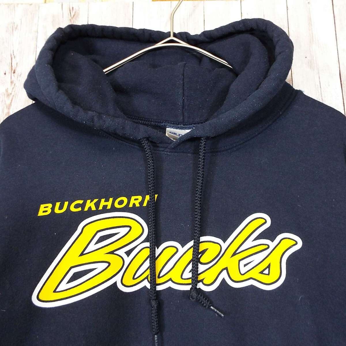 【チームロゴ】00s GILDAN ギルダン BUCKHORN BUCKS 長袖フーテッド パーカー Lサイズ(肩幅 63cm)ネイビー【湘南倉庫】2000年代 USメンズ古着 ビッグサイズ 17000635