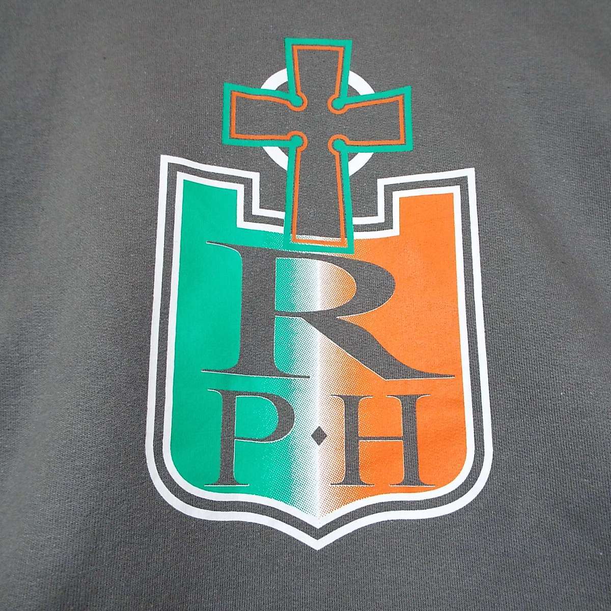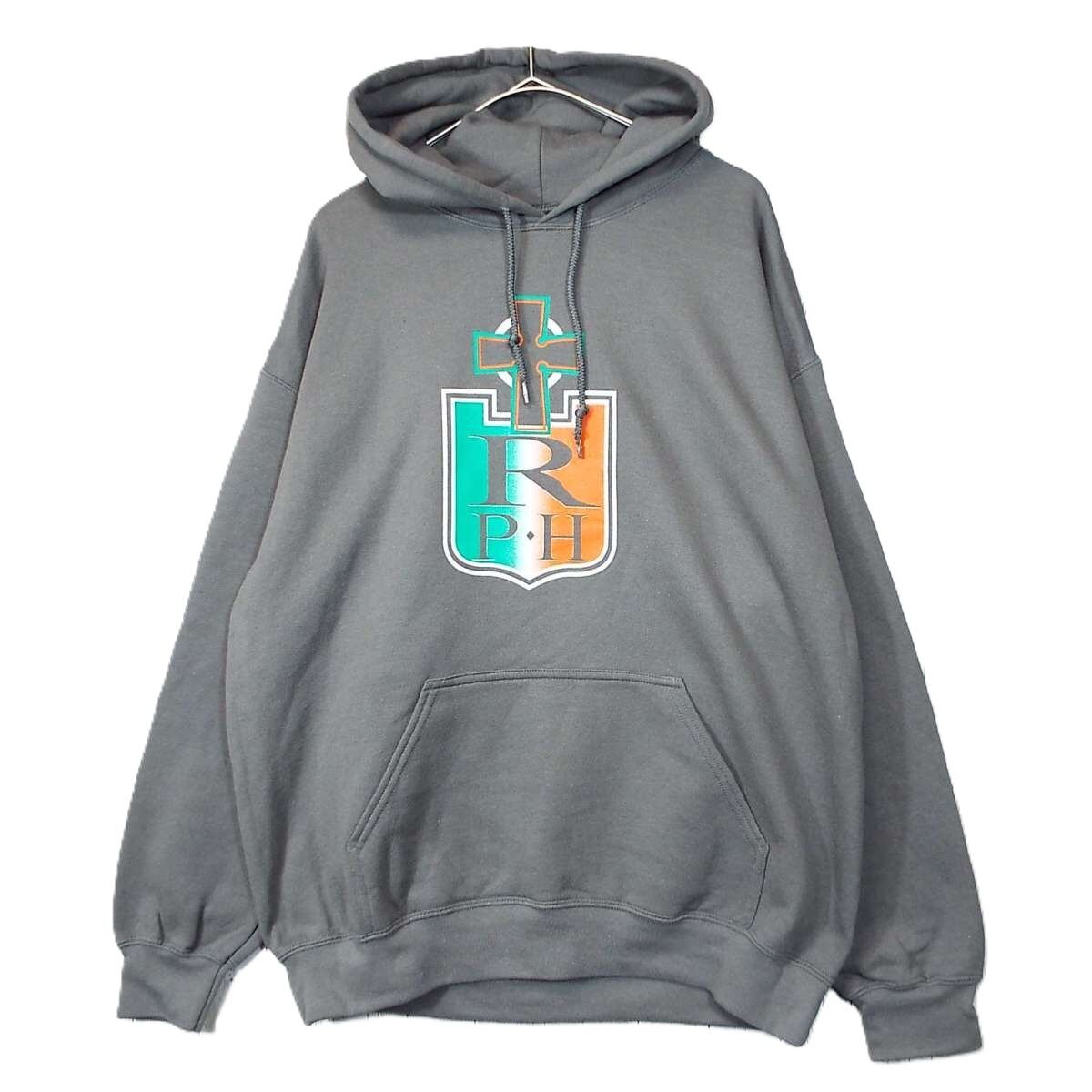 【十字架(クロス)デザイン】GILDAN ギルダン R P・H 大判プリントロゴ 長袖フーテッド パーカー Lサイズ(肩幅 65cm)チャコールブラウン【湘南倉庫】USメンズ古着 ビッグサイズ 17000673