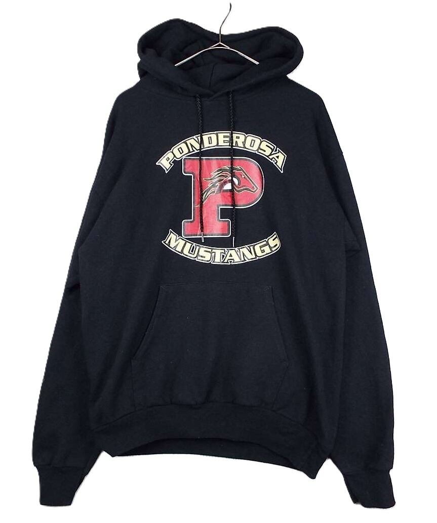 Hanes ヘインズ PONDEROSA MUSTANGS チーム アメフト 長袖フーテッド パーカー ブラック黒 USメンズ古着 Mサイズ【湘南倉庫】4912345006950