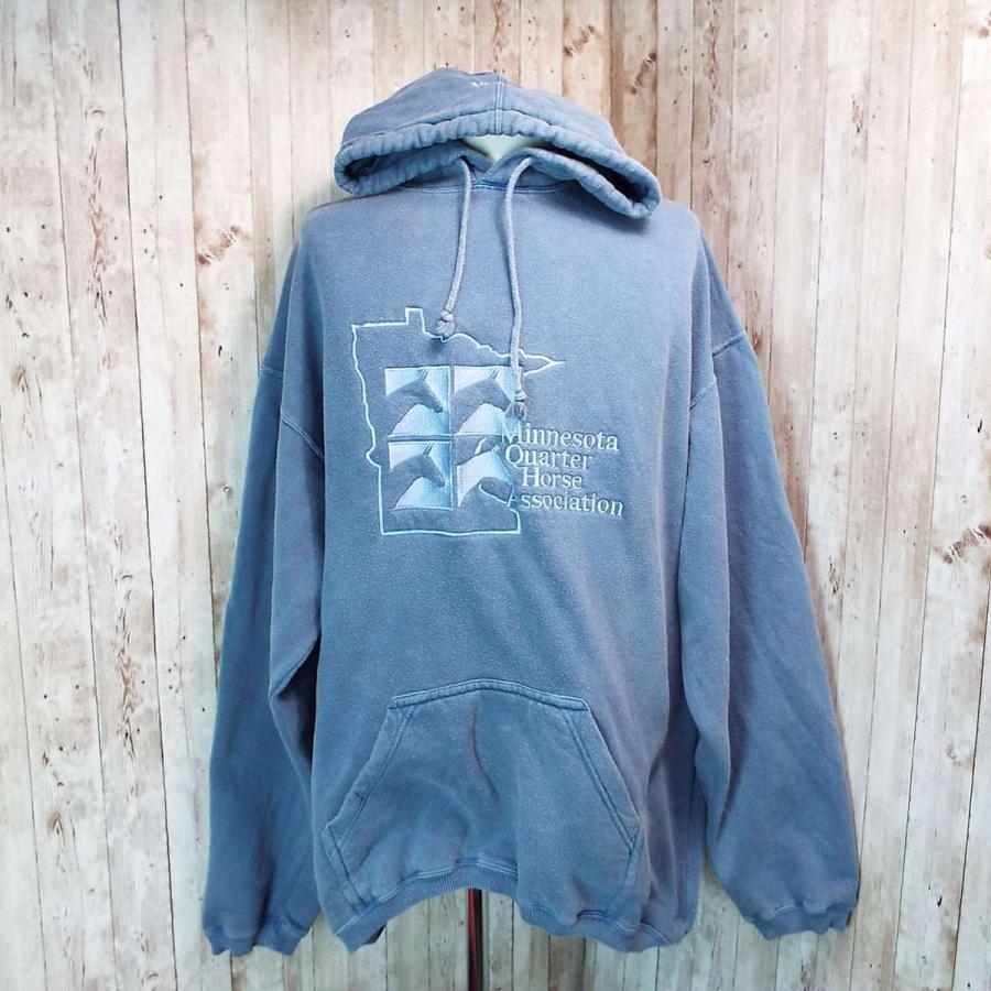 COTTON SMITH コットンスミス Minnesota Quarter Horse Association】馬柄刺繍入り 長袖プルオーバーパーカー Lサイズ ブルーグレー USメンズ古着【仙台倉庫】Y2K 12364176