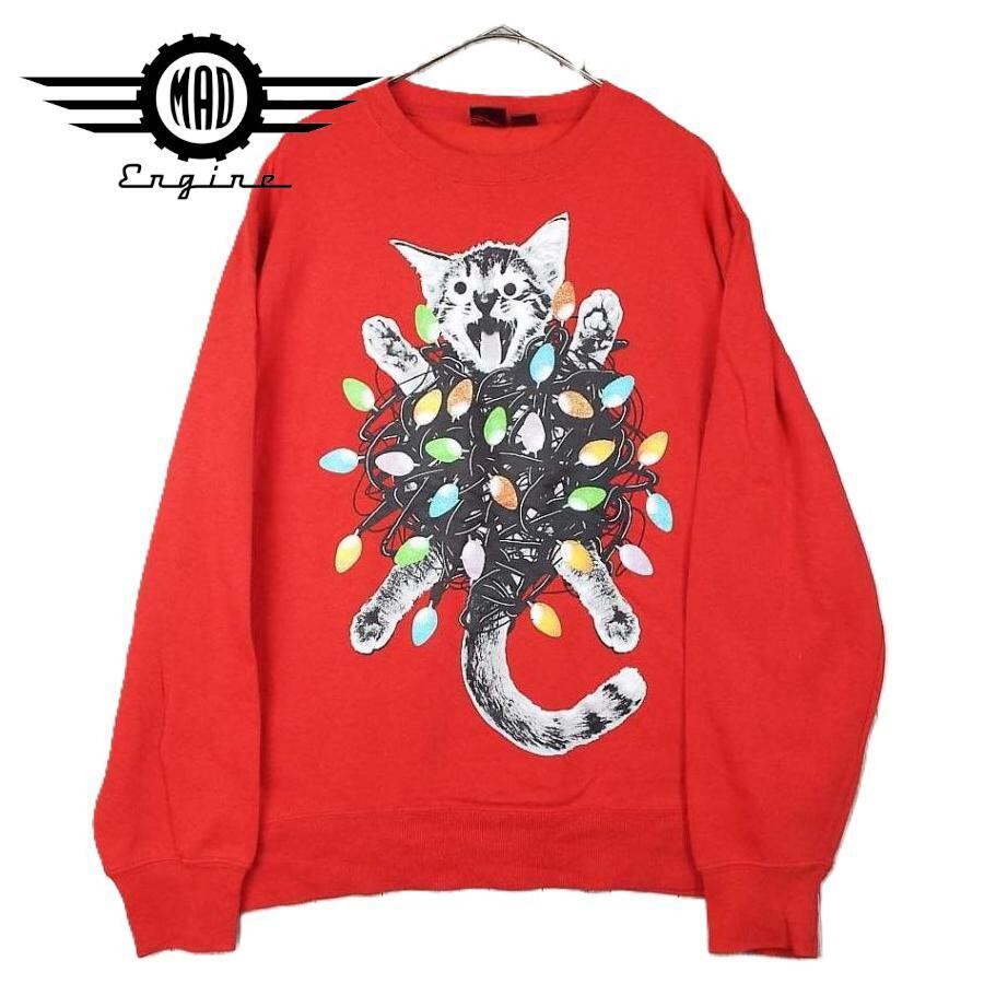 【SOLD OUT】◎クレイジーキャット◎ MAD ENGINE マッドエンジン 猫ちゃん ネコ ラメ入り クルーネック 長袖トレーナー スウエット MDサイズ レッド赤【仙台倉庫】US古着,"12362219"