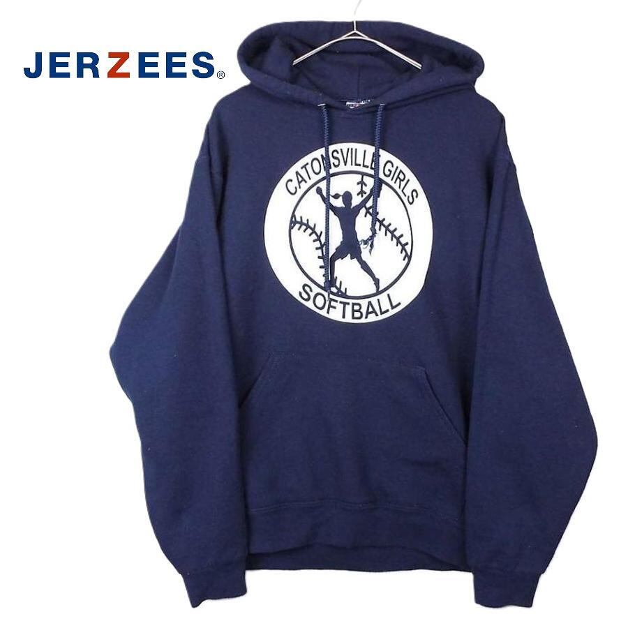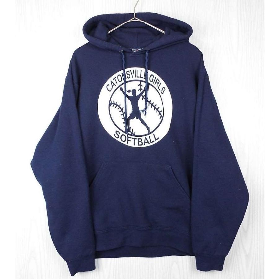 【アメリカ古着】◎ベースボール◎JERZEES CATONSVILLE GIRLS SOFTBALL チーム プリント 長袖パーカー Mサイズ(肩幅50cm)ネイビー紺【仙台倉庫】USアメリカメンズ古着,"49123450032321" 野球