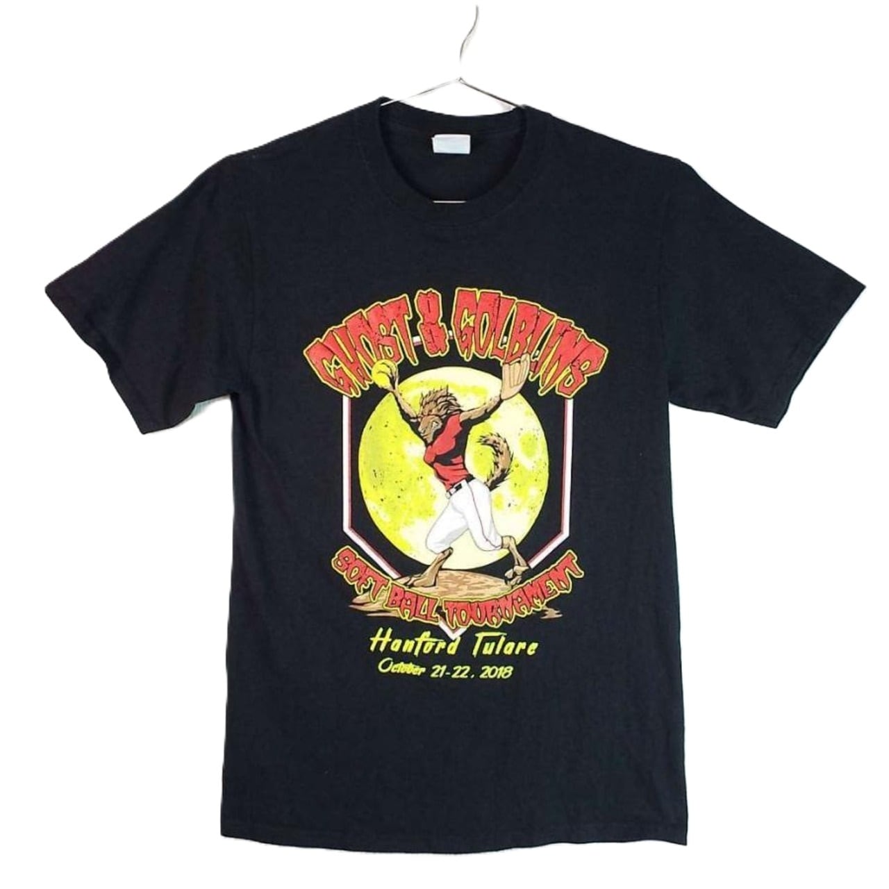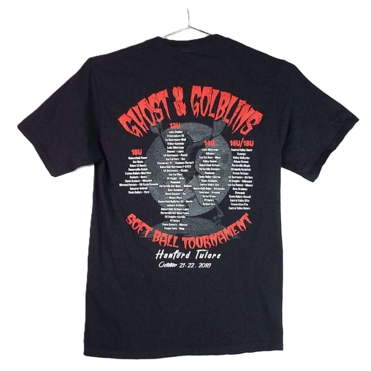 ◎肩幅40cm◎【チームロゴ】PORT AND COMPANY ポートアンドカンパニー GHOST&GOLBLINS SOFT BALL TOUNAMENT ソフトボール 大会記念 両面 カラープリント 半袖Tシャツ Sサイズ ブラック コットン100%【湘南倉庫】USA古着 T5