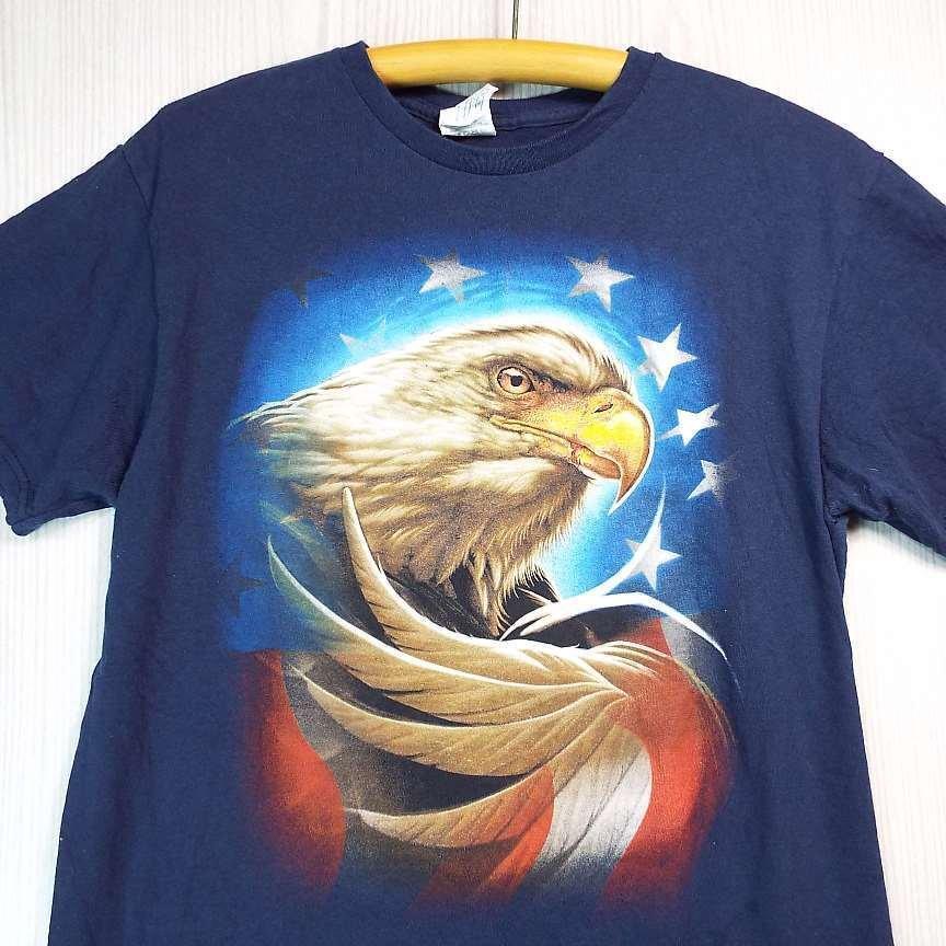 ◎肩幅45cm◎【アニマルプリント】DELTA PRO WEIGHT デルタプロウェイト 星条旗 鷹 ホーク 半袖Tシャツ Mサイズ ネイビー コットン100%【湘南倉庫】USAメンズ古着 T2