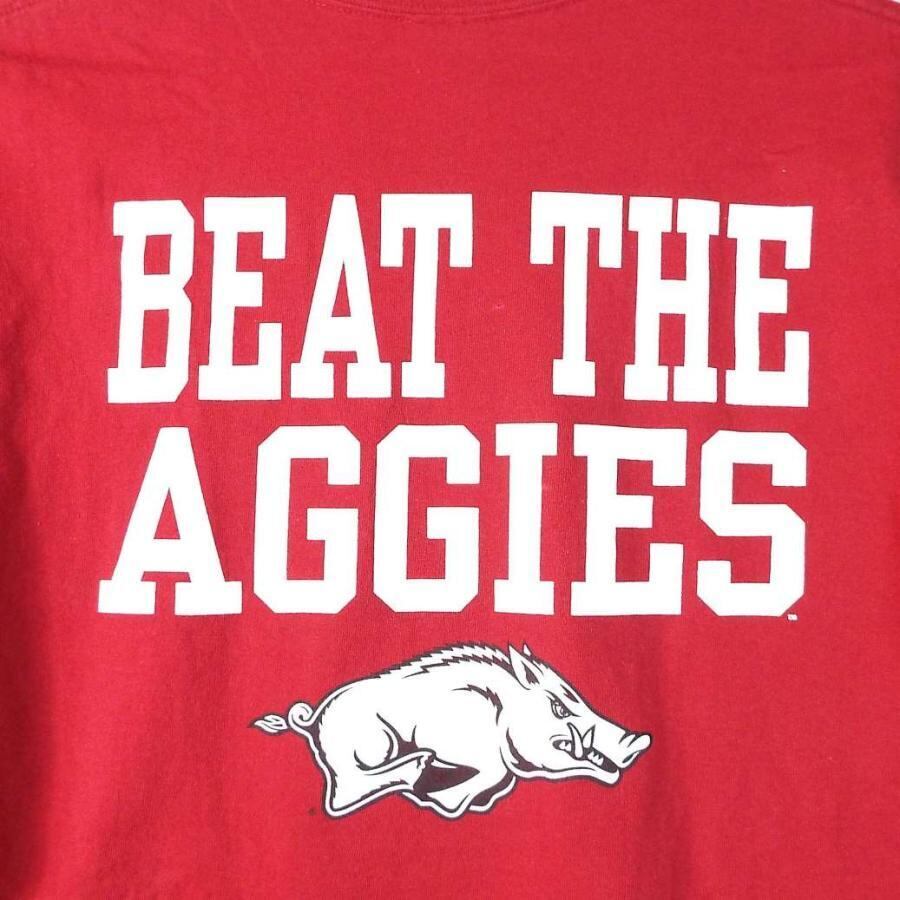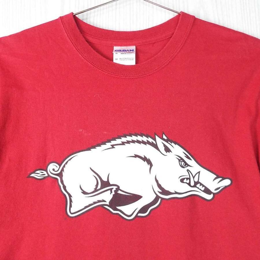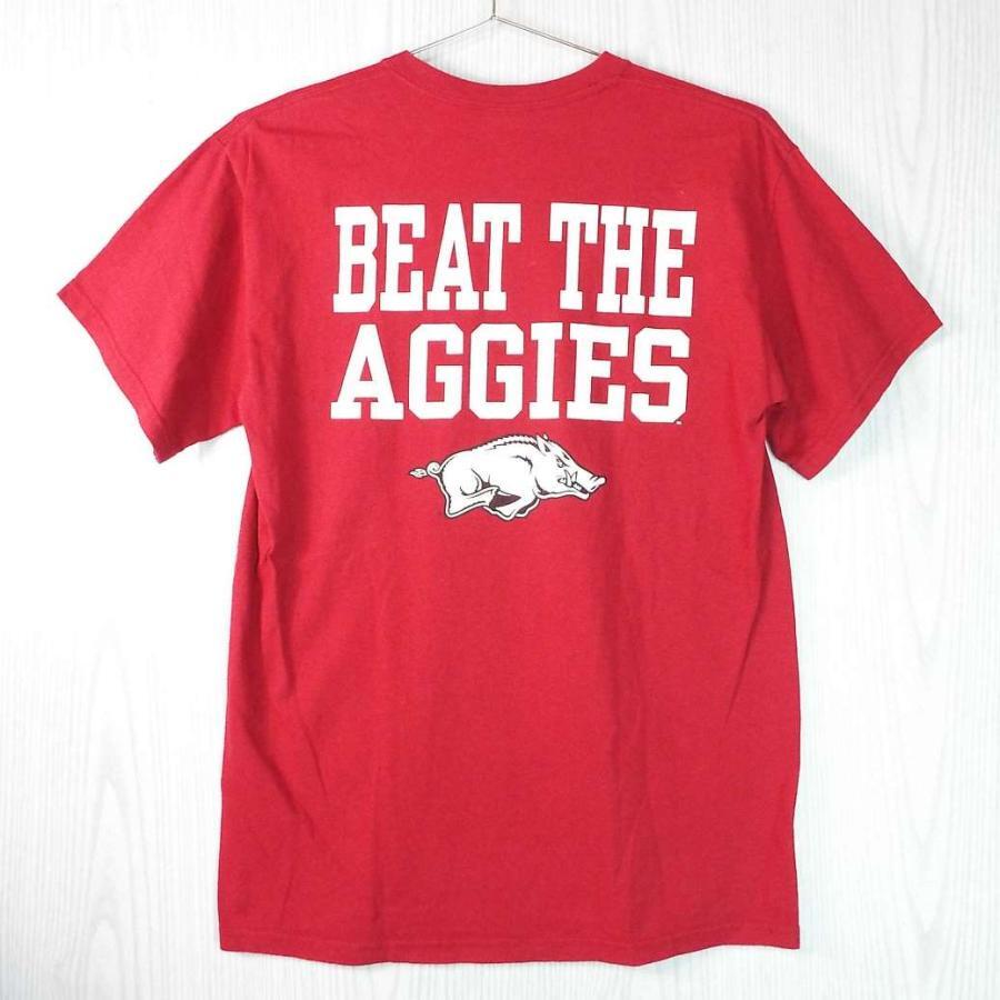 ◎肩幅47cm◎【カレッジロゴ】GILDAN ギルダン University of Arkansas アーカンソー大学 BEAT THE AGGIE TM 猪 イノシシ ビッグロゴ 両面プリント 半袖Tシャツ Mサイズ レッド コットン100%【湘南倉庫】USAメンズ古着 ULTRA COTTON