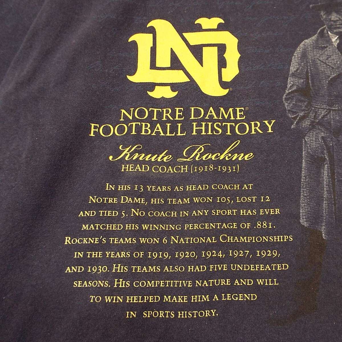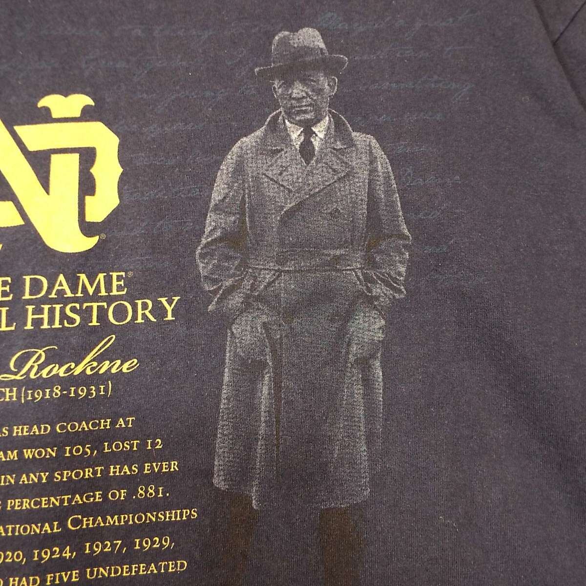 【伝説のNFLヘッドコーチ】00s Majestic マジェスティック NOTRE DAME FOOTBALL HISTORY Knute Rokne 偉人 プリント 半袖Tシャツ Lサイズ ◎肩幅53.5cm◎ネイビー コットン100%【湘南倉庫】2000年代 USA古着 T5 アメフト