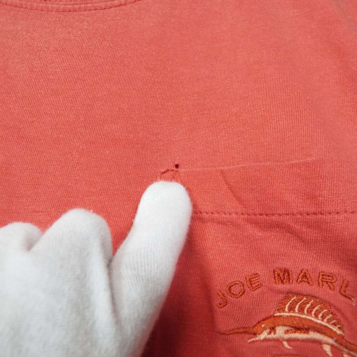 【胸ポケット付き】JOE MARLIN ジョーマーリン フィッシング カジキマグロ 魚 釣り 刺繍 半袖Tシャツ XLサイズ(肩幅55cm)オレンジレッド 【湘南倉庫】ダメージ USアメリカ古着