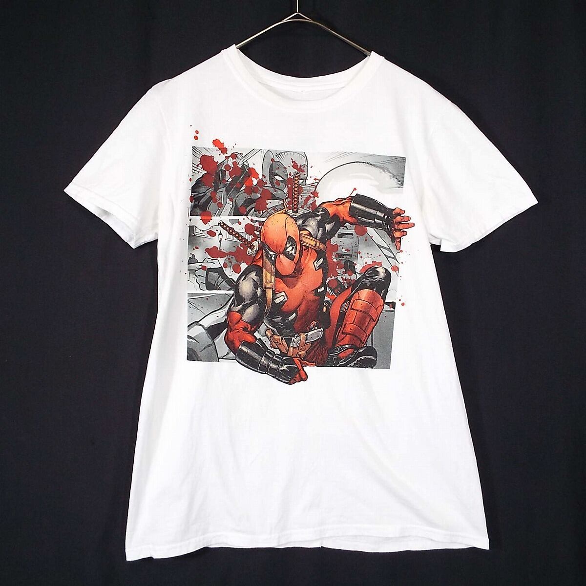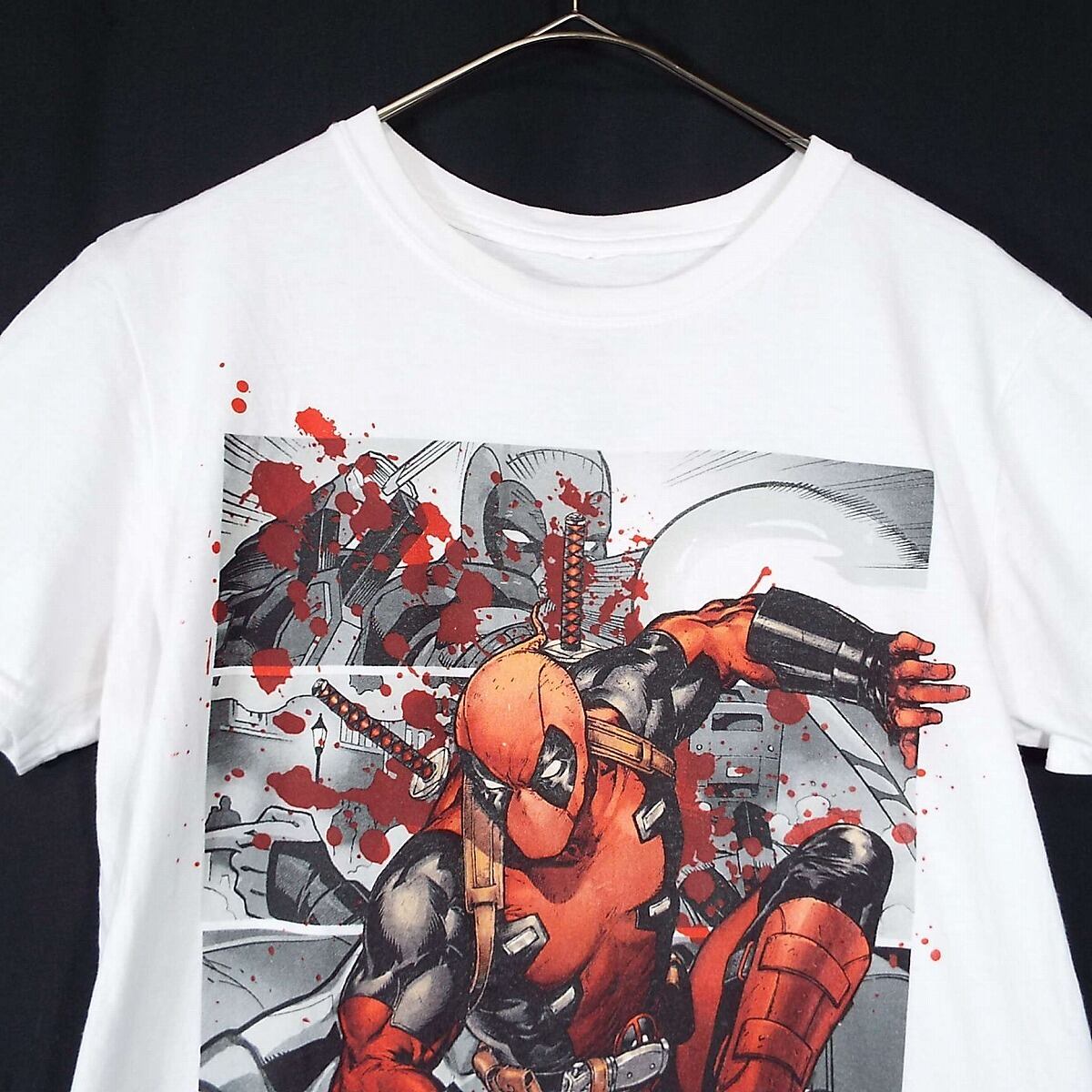 ◎肩幅42cm◎【キャラクター】MARVEL 映画マーベル公式 DEADPOOL デッドプール 大判プリント 半袖Tシャツ Mサイズ ホワイト コットン100%【湘南倉庫】USメンズ古着 白T62 17002912