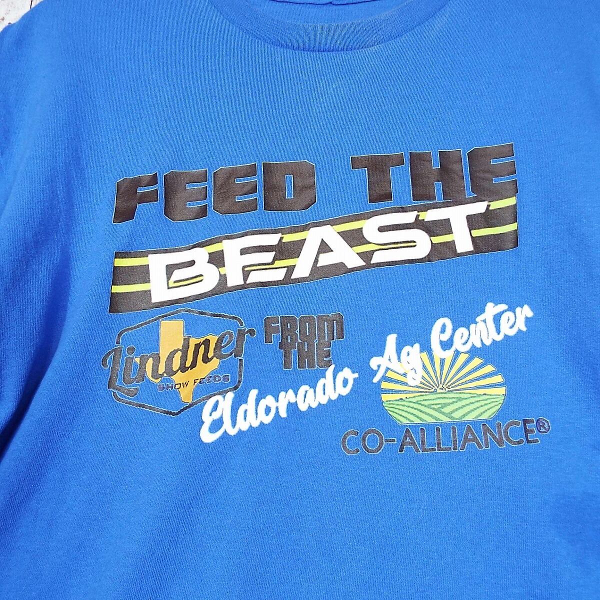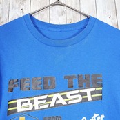 【やれ感Tシャツ】UN KNOWN FEED THE BEAST 企業ロゴ 半袖Tシャツ Mサイズ ブルー 【湘南倉庫】US古着 カラーTシャツ 12390212