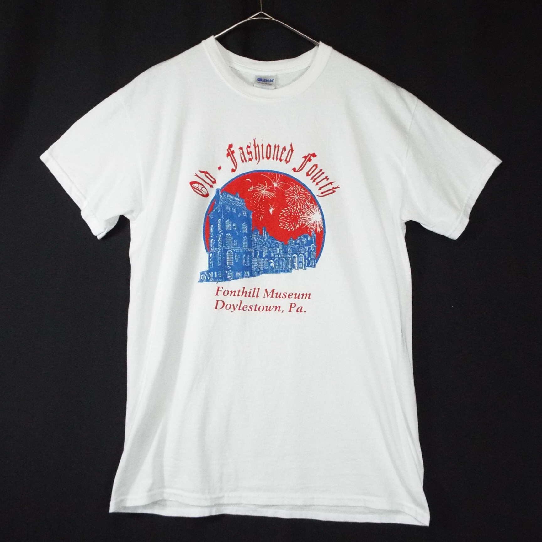 【大判プリント】GILDAN Fontill Museum Doylestown フォントヒル城 半袖Tシャツ M ホワイト コットン100%【湘南倉庫】メンズ古着 白Tシャツ 12390410