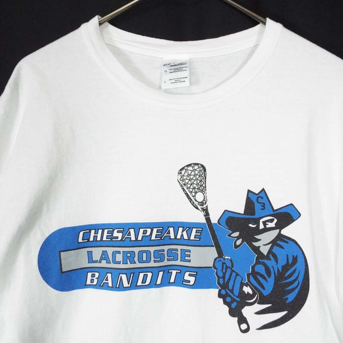 【肩幅51cm】【キャラクター】00年代 GILDAN CHESAPEAKE LACROSSE BANDITS リーム プリント 半袖Tシャツ Lサイズ ホワイト コットン100%【湘南倉庫】メンズ古着 17003193 白T