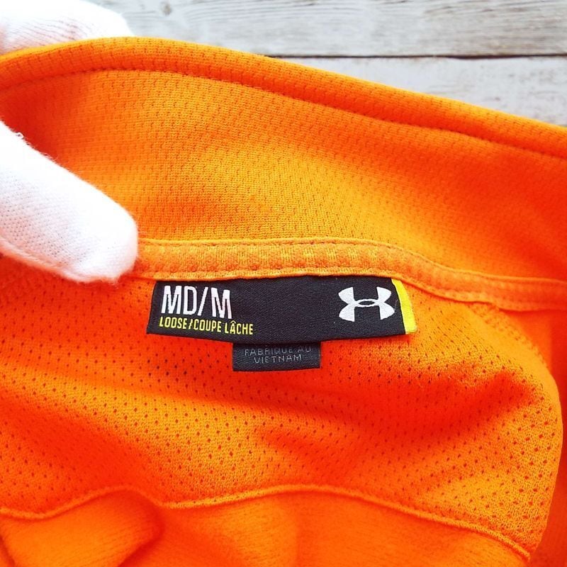 【通気性&速乾】UNDER ARMOUR アンダーアーマー メッシュ ブランド刺繍ロゴ トラックジャケット Mサイズ(身幅52cm)オレンジ 【湘南倉庫】USブランド古着 トレッキング アウトドア ジャージ